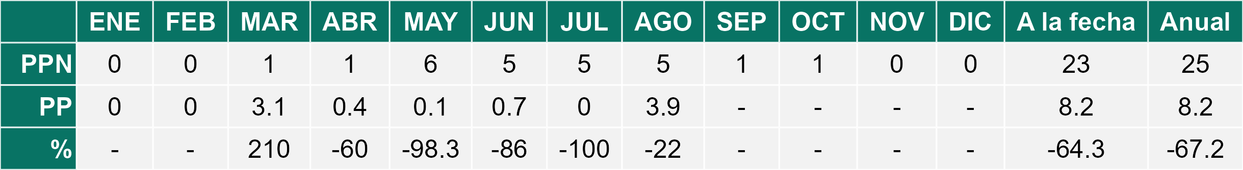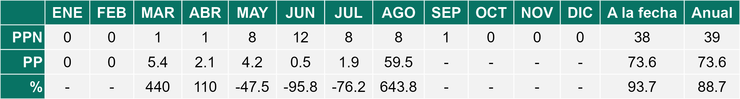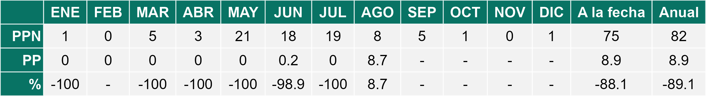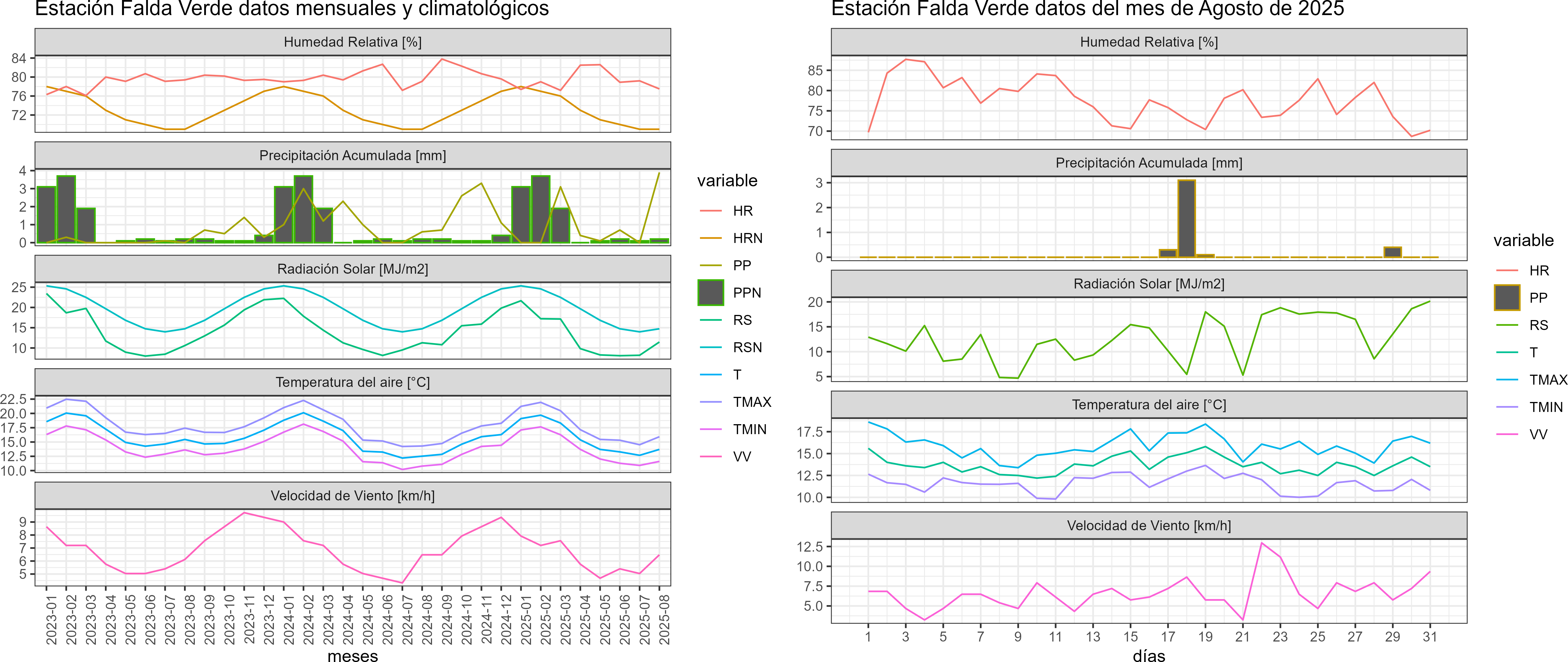 La estación Falda Verde corresponde al distrito agroclimático 15-3-1. Para este distrito climático la temperatura mínima, media y máxima climatológicas alcanzan los 8.1°C, 11.4°C y 14.7°C respectivamente. Por su parte, respecto a las temperaturas medidas durante el mes de agosto en la estación: la temperatura mínima alcanzo los 11.6°C (3.5°C sobre la climatológica), la temperatura media 13.7°C (2.3°C sobre la climatológica) y la temperatura máxima llegó a los 15.9°C (1.2°C sobre la climatológica). En el mes de agosto se registró una pluviometría de 3.9 mm, lo cual representa un 78% con respecto al mismo mes de un año normal. De enero a agosto se ha registrado un total acumulado de 8.2 mm, en circunstancias que un año normal registraría a la fecha 23 mm, lo que representa un déficit de 64.3%. A la misma fecha, durante el año 2024 la precipitación alcanzaba los 0.6 mm.