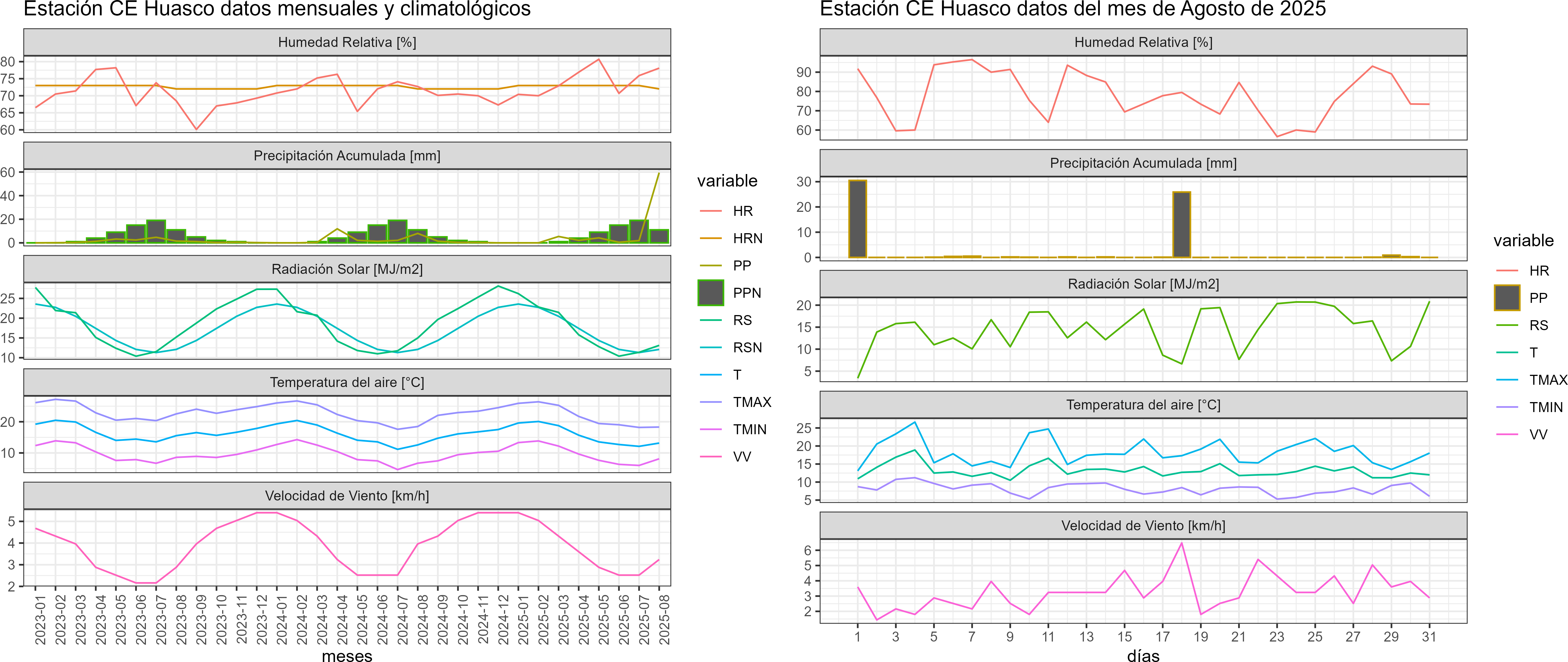 La estación CE Huasco corresponde al distrito agroclimático 3-4-2. Para este distrito climático la temperatura mínima, media y máxima climatológicas alcanzan los 6.3°C, 14.2°C y 22.1°C respectivamente. Por su parte, respecto a las temperaturas medidas durante el mes de agosto en la estación: la temperatura mínima alcanzo los 8.1°C (1.8°C sobre la climatológica), la temperatura media 13.2°C (-1°C bajo la climatológica) y la temperatura máxima llegó a los 18.3°C (-3.8°C bajo la climatológica). En el mes de agosto se registró una pluviometría de 59.5 mm, lo cual representa un 743.8% con respecto al mismo mes de un año normal. De enero a agosto se ha registrado un total acumulado de 73.6 mm, en circunstancias que un año normal registraría a la fecha 38 mm, lo que representa un superávit de 93.7%. A la misma fecha, durante el año 2024 la precipitación alcanzaba los 8 mm.