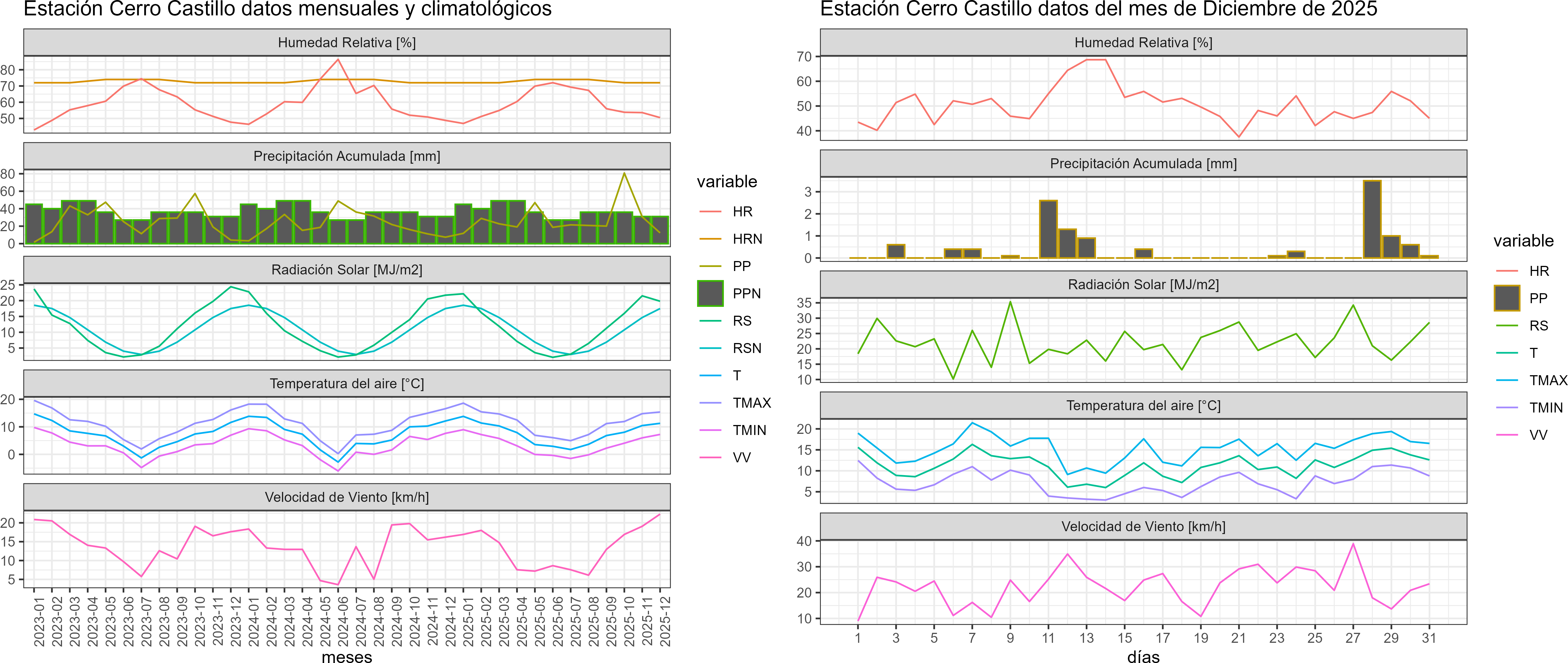 La estación Cerro Castillo corresponde al distrito agroclimático 12-4. Para este distrito climático la temperatura mínima, media y máxima climatológicas alcanzan los 5.1°C, 10.4°C y 15.7°C respectivamente. Por su parte, respecto a las temperaturas medidas durante el mes de diciembre en la estación: la temperatura mínima alcanzo los 7.2°C (2.1°C sobre la climatológica), la temperatura media 11.3°C (0.9°C sobre la climatológica) y la temperatura máxima llegó a los 15.4°C (-0.3°C bajo la climatológica). En el mes de diciembre se registró una pluviometría de 12.3 mm, lo cual representa un 37.3% con respecto al mismo mes de un año normal. De enero a diciembre se ha registrado un total acumulado de 334.3 mm, en circunstancias que un año normal registraría a la fecha 394 mm, lo que representa un déficit de 15.2%. A la misma fecha, durante el año 2024 la precipitación alcanzaba los 7.4 mm.