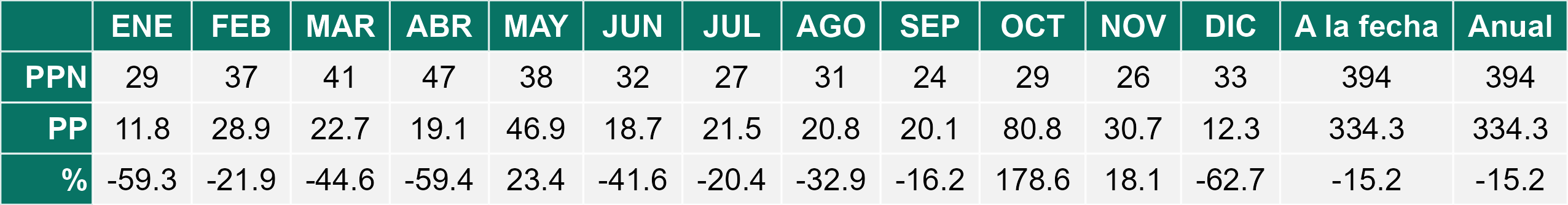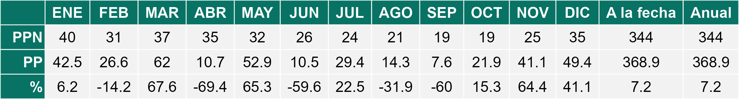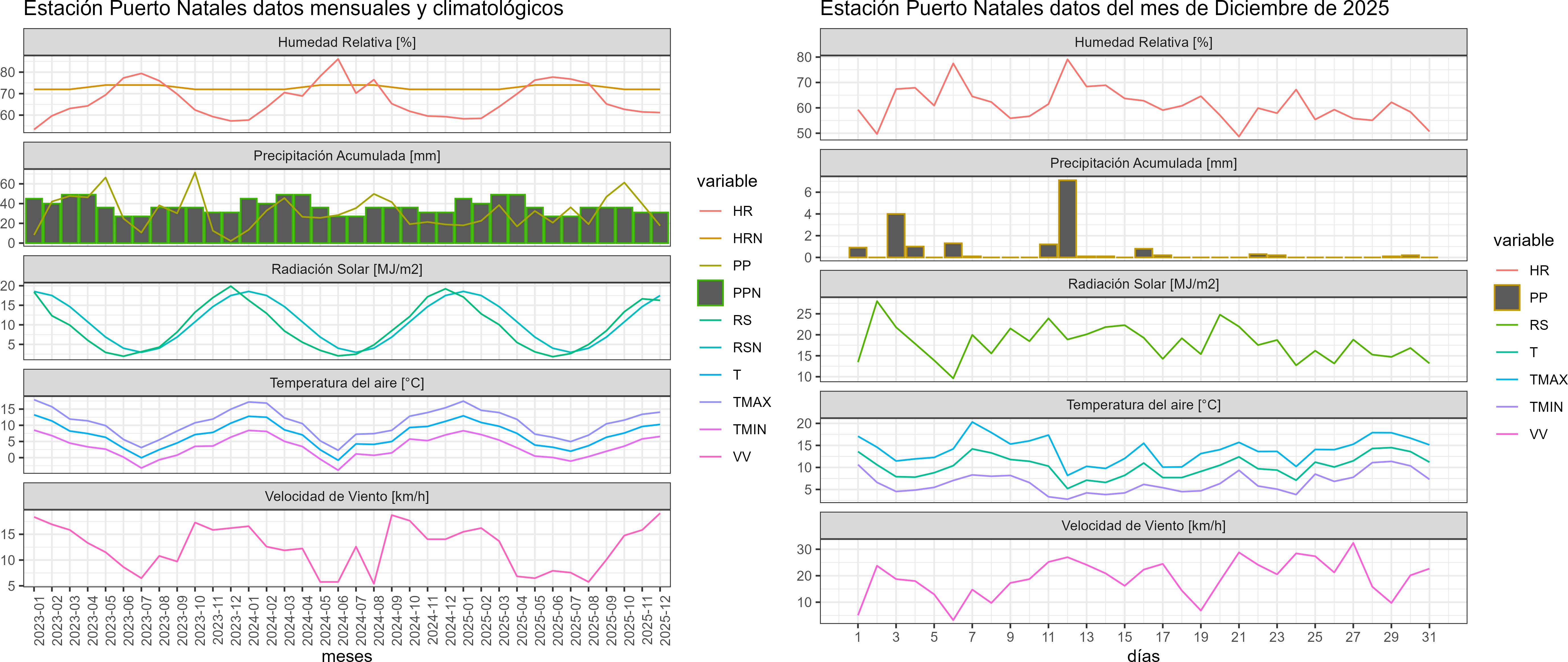 La estación Puerto Natales corresponde al distrito agroclimático 12-4. Para este distrito climático la temperatura mínima, media y máxima climatológicas alcanzan los 5.5°C, 9.9°C y 14.3°C respectivamente. Por su parte, respecto a las temperaturas medidas durante el mes de diciembre en la estación: la temperatura mínima alcanzo los 6.5°C (1°C sobre la climatológica), la temperatura media 10.3°C (0.4°C sobre la climatológica) y la temperatura máxima llegó a los 14.1°C (-0.2°C bajo la climatológica). En el mes de diciembre se registró una pluviometría de 17.6 mm, lo cual representa un 22.6% con respecto al mismo mes de un año normal. De enero a diciembre se ha registrado un total acumulado de 370.1 mm, en circunstancias que un año normal registraría a la fecha 808 mm, lo que representa un déficit de 54.2%. A la misma fecha, durante el año 2024 la precipitación alcanzaba los 18.9 mm.