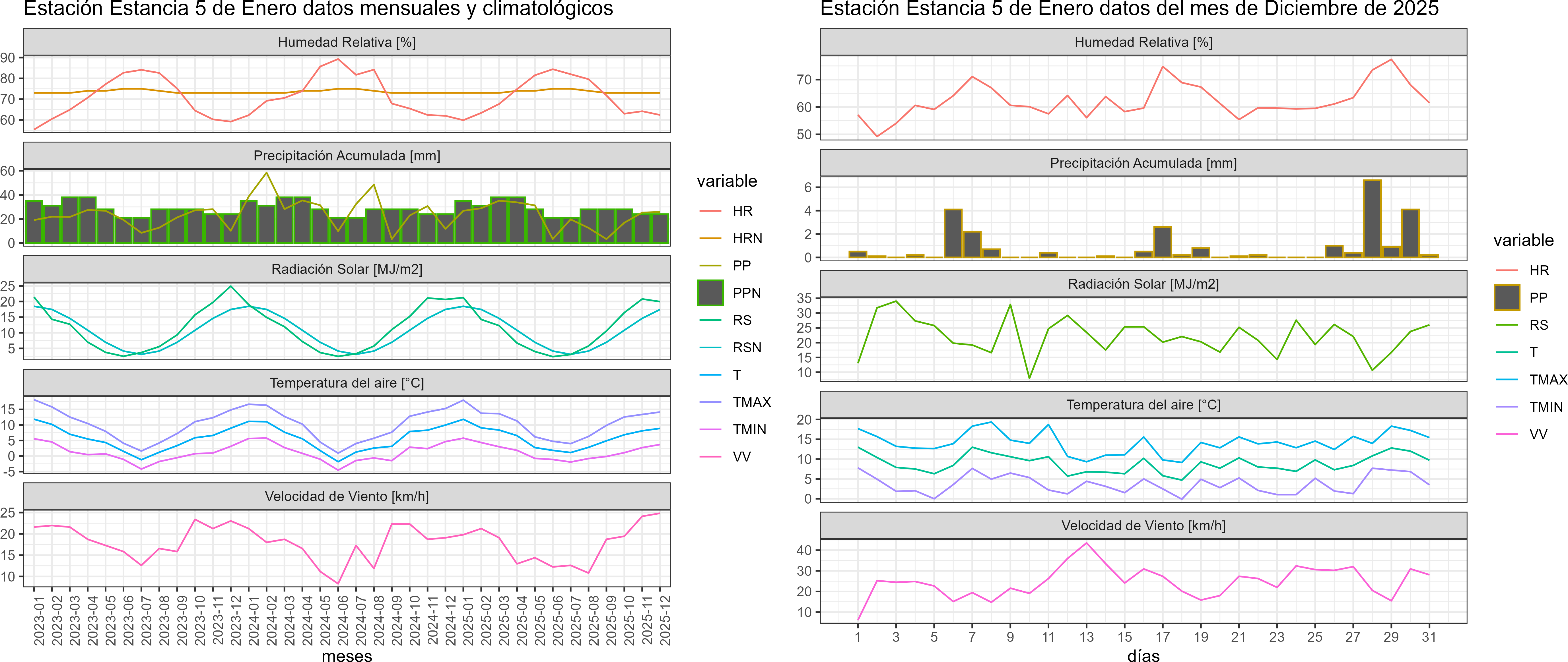 La estación Estancia 5 de Enero corresponde al distrito agroclimático 12-5. Para este distrito climático la temperatura mínima, media y máxima climatológicas alcanzan los 4.3°C, 9.7°C y 15.1°C respectivamente. Por su parte, respecto a las temperaturas medidas durante el mes de diciembre en la estación: la temperatura mínima alcanzo los 3.7°C (-0.6°C bajo la climatológica), la temperatura media 8.9°C (-0.8°C bajo la climatológica) y la temperatura máxima llegó a los 14.2°C (-0.9°C bajo la climatológica). En el mes de diciembre se registró una pluviometría de 25.9 mm, lo cual representa un 63.2% con respecto al mismo mes de un año normal. De enero a diciembre se ha registrado un total acumulado de 263.1 mm, en circunstancias que un año normal registraría a la fecha 372 mm, lo que representa un déficit de 29.3%. A la misma fecha, durante el año 2024 la precipitación alcanzaba los 11.8 mm.
