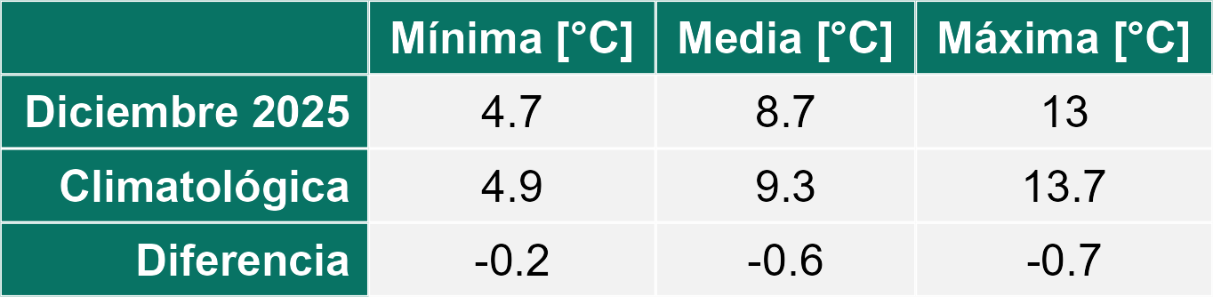 Diciembre 2025 registró en general una precipitación menor a la histórica, entre leve y severa. Se termina el año 2025 con un preocupante déficit de precipitaciones que se mueve entre el 15 y hasta sobre el 50%, respecto de un año normal, con la excepción de dos estaciones (Zenia y Punta Arenas Rural) que terminaron el 2025 con un muy leve superávit, respecto a precipitación histórica. Respecto a temperatura media, diciembre 2025 fue levemente más frío en la mayoría de las estaciones de registro distribuidas en Magallanes.