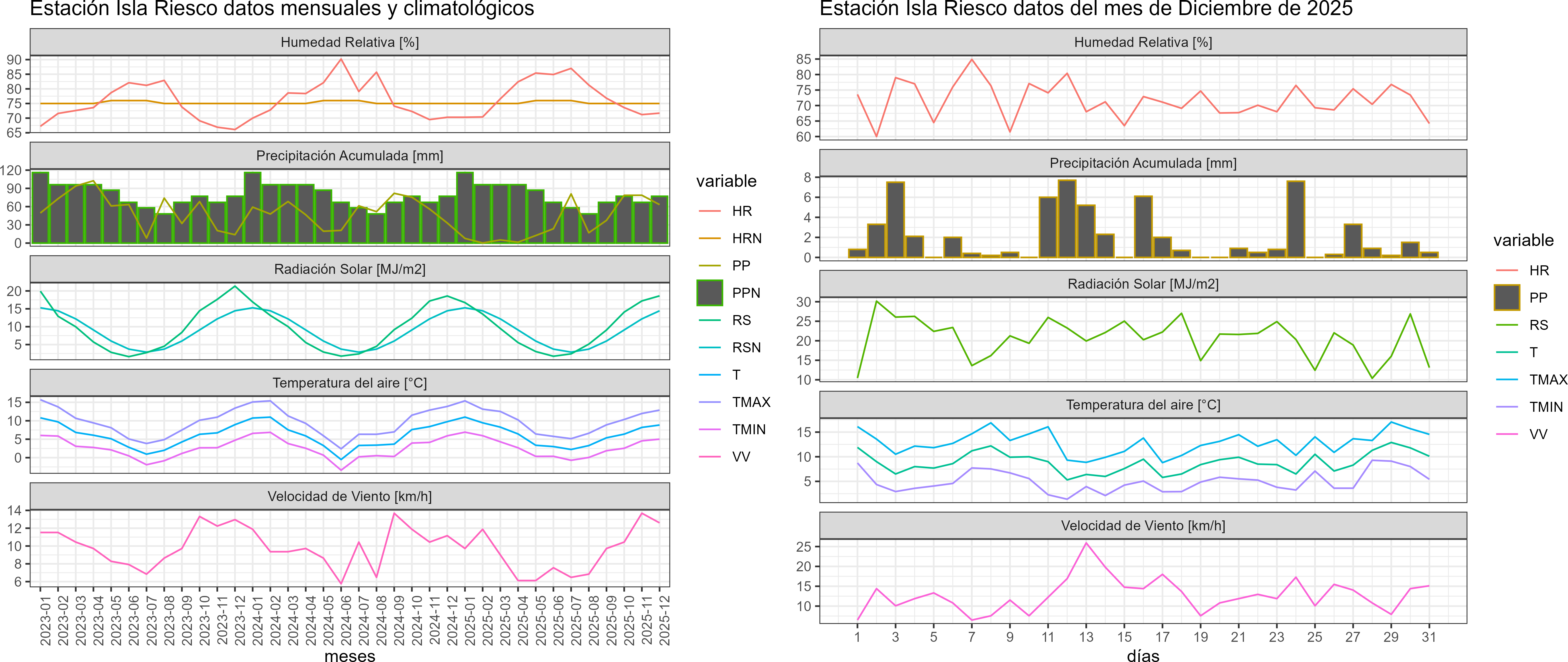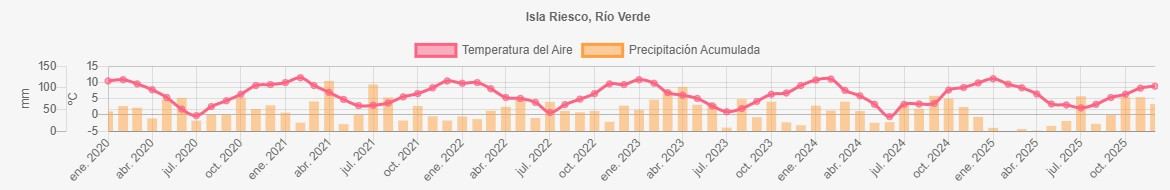 La estación Isla Riesco corresponde al distrito agroclimático 12-3. Para este distrito climático la temperatura mínima, media y máxima climatológicas alcanzan los 6.1°C, 9.5°C y 13°C respectivamente. Por su parte, respecto a las temperaturas medidas durante el mes de diciembre en la estación: la temperatura mínima alcanzo los 5°C (-1.1°C bajo la climatológica), la temperatura media 8.8°C (-0.7°C bajo la climatológica) y la temperatura máxima llegó a los 12.9°C (-0.1°C bajo la climatológica). En el mes de diciembre se registró una pluviometría de 63.3 mm, lo cual representa un 86.7% con respecto al mismo mes de un año normal. De enero a diciembre se ha registrado un total acumulado de 406.5 mm, en circunstancias que un año normal registraría a la fecha 833 mm, lo que representa un déficit de 51.2%. A la misma fecha, durante el año 2024 la precipitación alcanzaba los 33.1 mm.