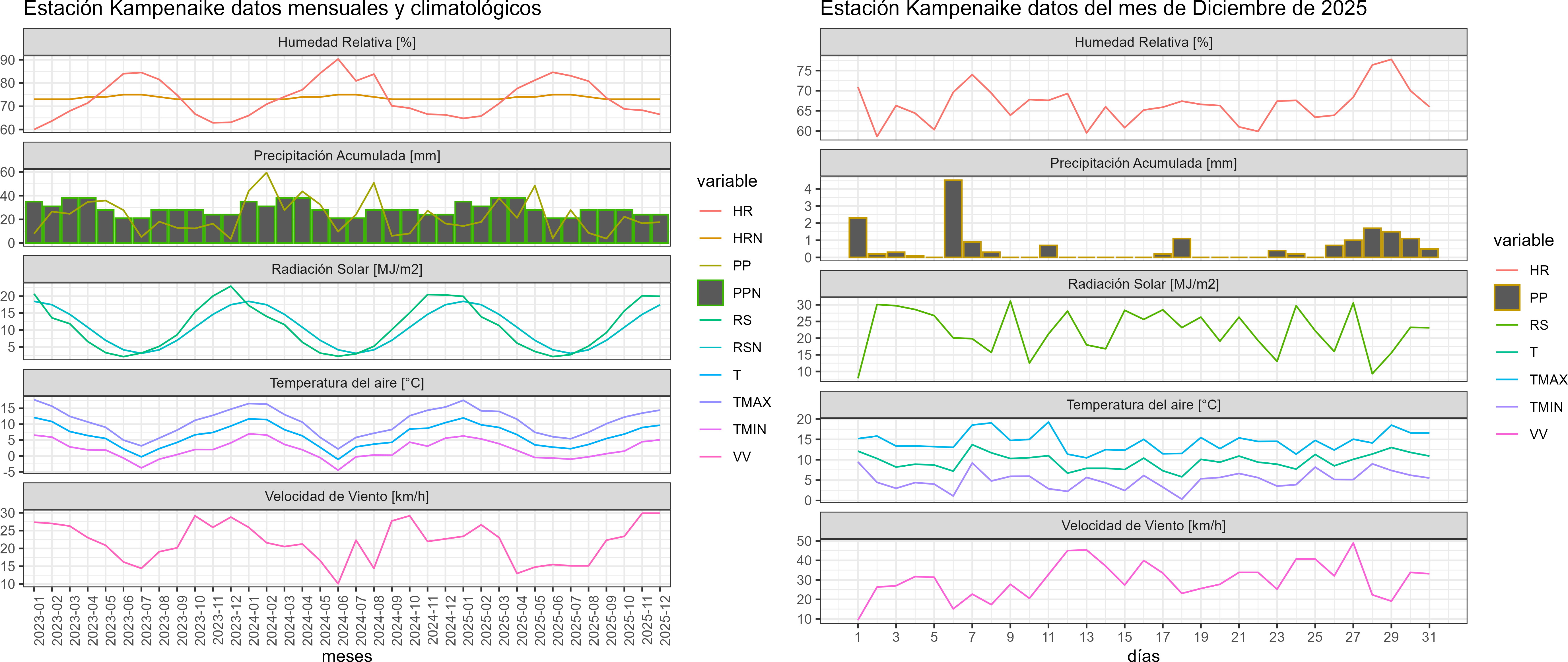 La estación Kampenaike corresponde al distrito agroclimático 12-5. Para este distrito climático la temperatura mínima, media y máxima climatológicas alcanzan los 4.9°C, 9.9°C y 14.9°C respectivamente. Por su parte, respecto a las temperaturas medidas durante el mes de diciembre en la estación: la temperatura mínima alcanzo los 5.1°C (0.2°C sobre la climatológica), la temperatura media 9.7°C (-0.2°C bajo la climatológica) y la temperatura máxima llegó a los 14.4°C (-0.5°C bajo la climatológica). En el mes de diciembre se registró una pluviometría de 17.7 mm, lo cual representa un 47.8% con respecto al mismo mes de un año normal. De enero a diciembre se ha registrado un total acumulado de 240.9 mm, en circunstancias que un año normal registraría a la fecha 360 mm, lo que representa un déficit de 33.1%. A la misma fecha, durante el año 2024 la precipitación alcanzaba los 16.5 mm.