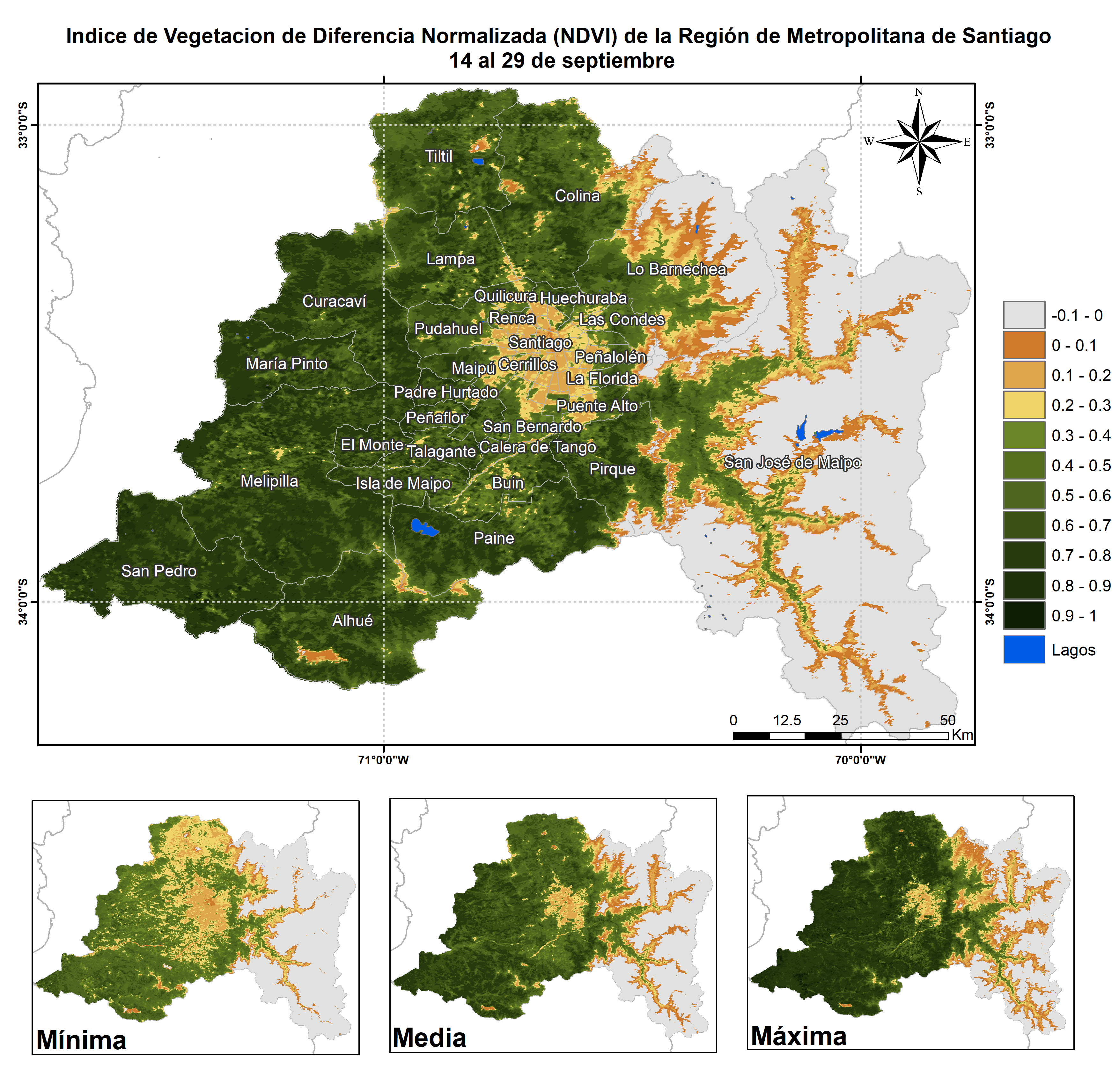 Respecto de la respuesta fisiológica de las plantas al efecto del clima, las imágenes satelitales reflejan la magnitud del crecimiento o disminución de la cobertura vegetal en esta época del año mediante el índice de vegetación NDVI (Desviación Normalizada del Índice de Vegetación).
