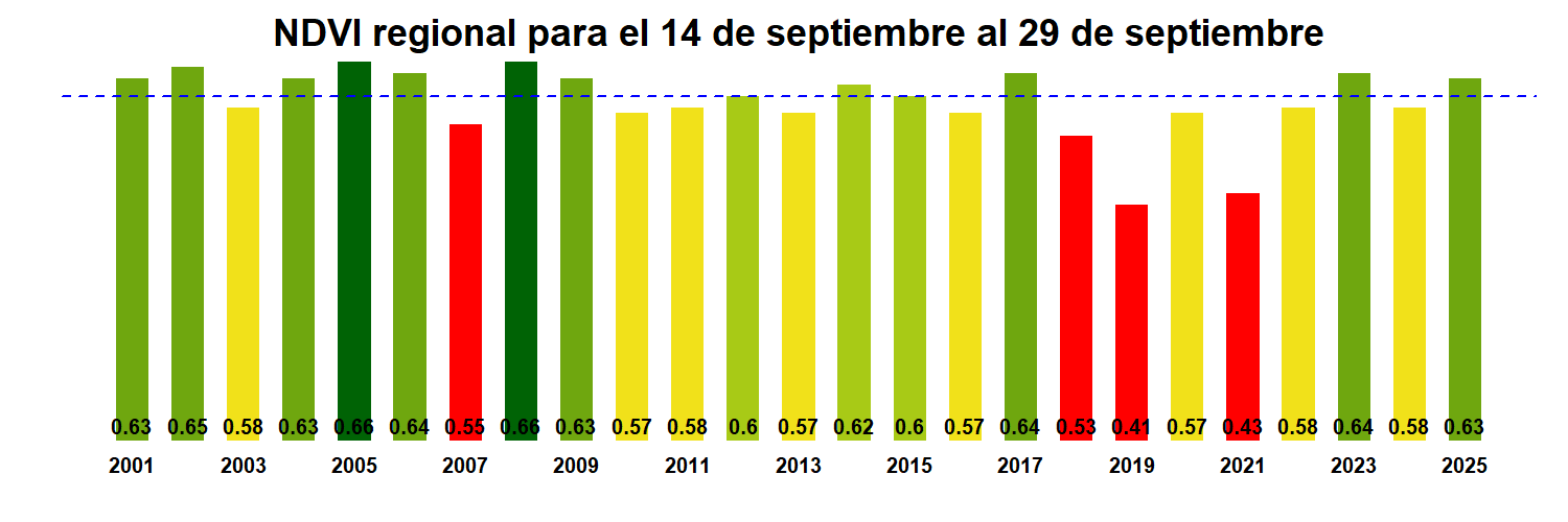 Para esta quincena se observa un NDVI promedio regional de 0.63 mientras el año pasado había sido de 0.58. El valor promedio histórico para esta región, en este período del año es de 0.59.