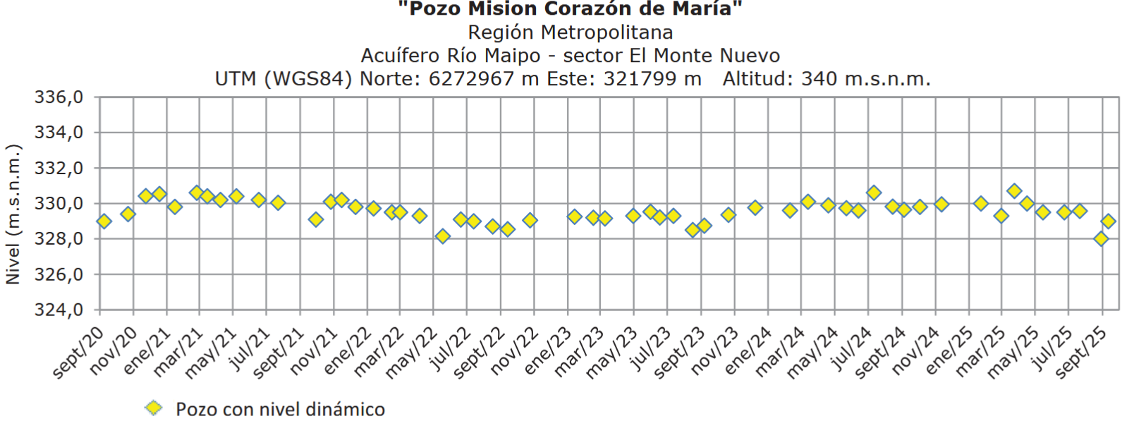 En el acuífero Río Maipo, sector El Monte Nuevo, el pozo Corazón de María se mantiene estable, con niveles dinámicos 329 m.s.n.m., presentando un aumento de 1 m en comparación con agosto lo que equivale a 18 m desde la superficie.