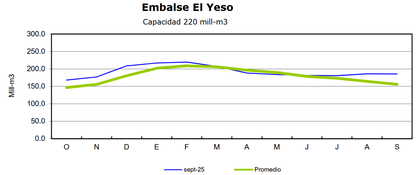 Finalmente, el Embalse El Yeso alcanzó al 30 de septiembre un volumen de 185,3 millones de m³, lo que corresponde al 84% de su capacidad total. Este nivel representa un 8,9% más que en septiembre de 2024 (170,2 millones m³) y un 18,8% superior al promedio histórico mensual (156 millones m³).