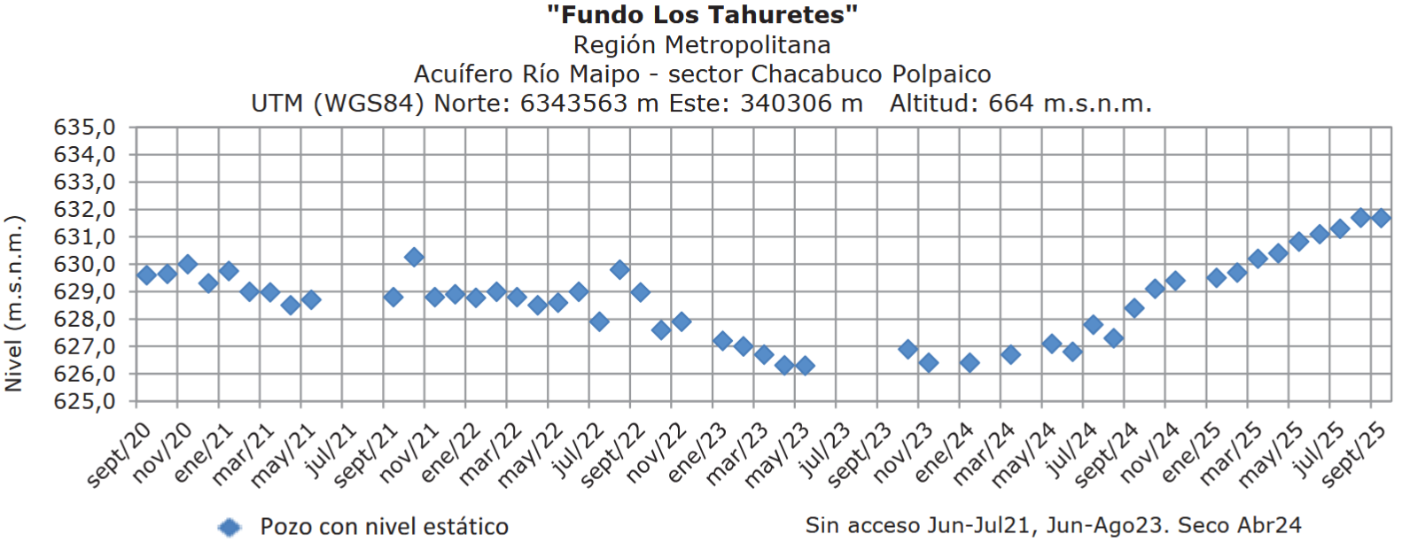En el sector Chacabuco/Polpaico, el pozo Fundo Los Tahuretes continúa con un claro proceso de recuperación, alcanzando en agosto 2025 un nivel estático cercano a los 632 m.s.n.m., reafirmando la tendencia al alza registrada durante este año, sin una gran variación en comparación al mes anterior.