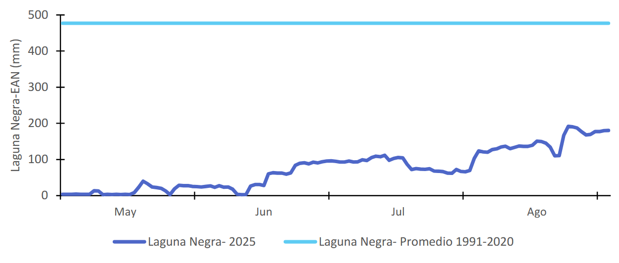Respecto del manto nival, la serie de Laguna Negra (Maipo) muestra que el Equivalente de Agua Nieve (EAN) 2025 se mantuvo muy por debajo del promedio 1991–2020 a lo largo del período de acumulación, llegando a un valor acumulado para el periodo 2025 de 225 mm, presentando un déficit del 53% en relación al valor promedio y un 58% inferior al año anterior.