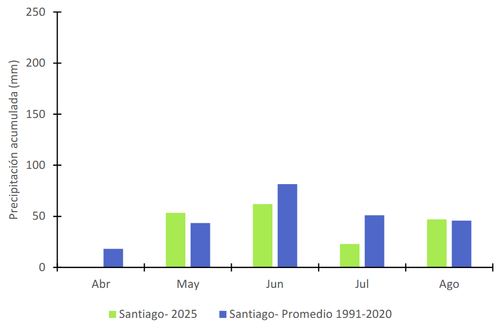 Al analizar el comportamiento de la precipitación acumulada mensual entre abril y agosto de 2025 para la estación de Santiago se observa que abril, junio y julio registran valores por bajo el promedio 1991-2020, mientras que mayo y agosto se ubican cercano al promedio.