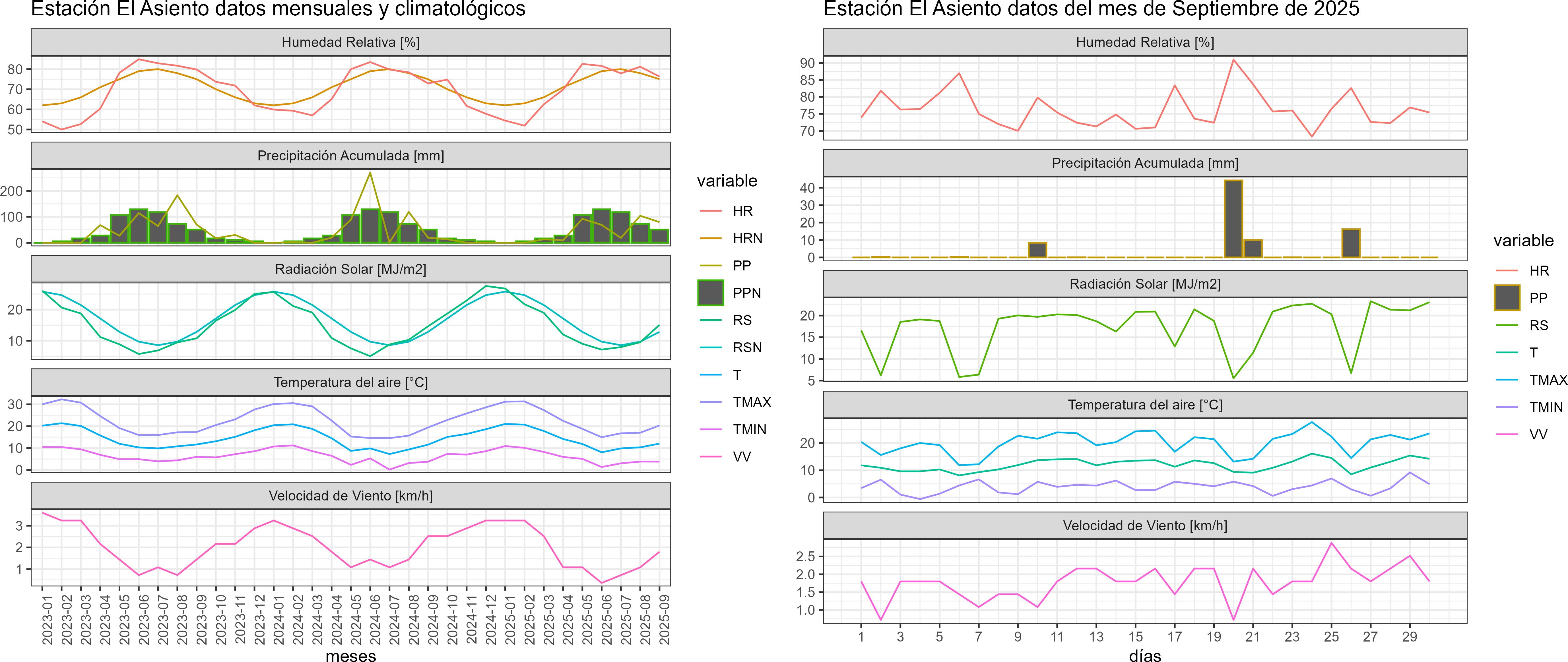 La estación El Asiento corresponde al distrito agroclimático 13-6-1. Para este distrito climático la temperatura mínima, media y máxima climatológicas alcanzan los 4.8°C, 11.5°C y 18.3°C respectivamente. Por su parte, respecto a las temperaturas medidas durante el mes de septiembre en la estación: la temperatura mínima alcanzo los 3.9°C (-0.9°C bajo la climatológica), la temperatura media 12°C (0.5°C sobre la climatológica) y la temperatura máxima llegó a los 20.1°C (1.8°C sobre la climatológica). En el mes de septiembre se registró una pluviometría de 79.6 mm, lo cual representa un 165.8% con respecto al mismo mes de un año normal. De enero a septiembre se ha registrado un total acumulado de 388 mm, en circunstancias que un año normal registraría a la fecha 518 mm, lo que representa un déficit de 25.1%. A la misma fecha, durante el año 2024 la precipitación alcanzaba los 19.8 mm.