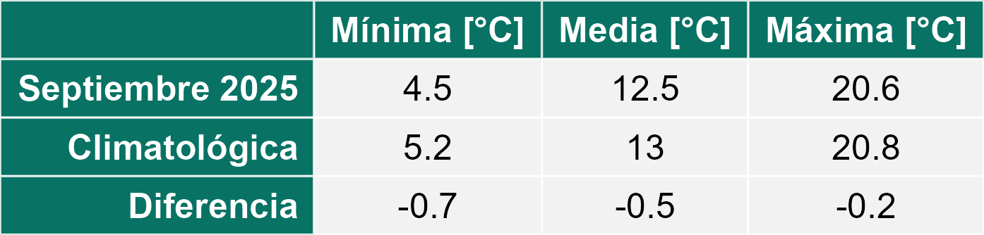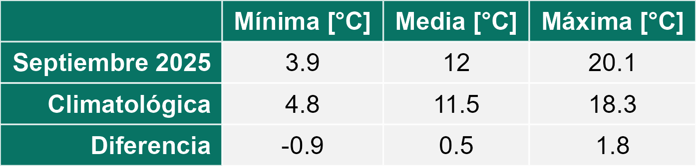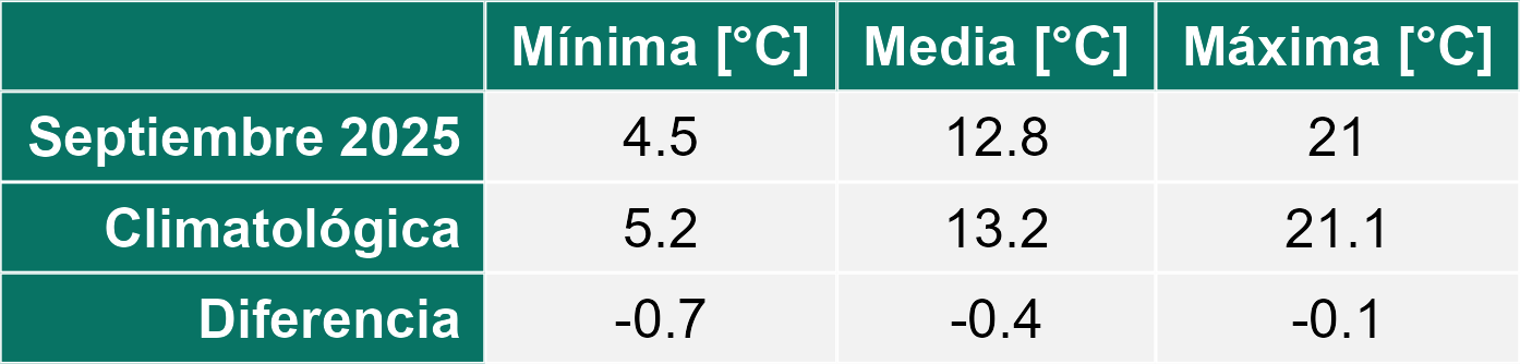 Septiembre se presentó con una condición de tiempo con presencia de precipitaciones moderadas para la época de primavera. También se registró un ascenso marcado en las temperaturas máximas y un leve ascenso de las mínimas medias en toda la Región.
