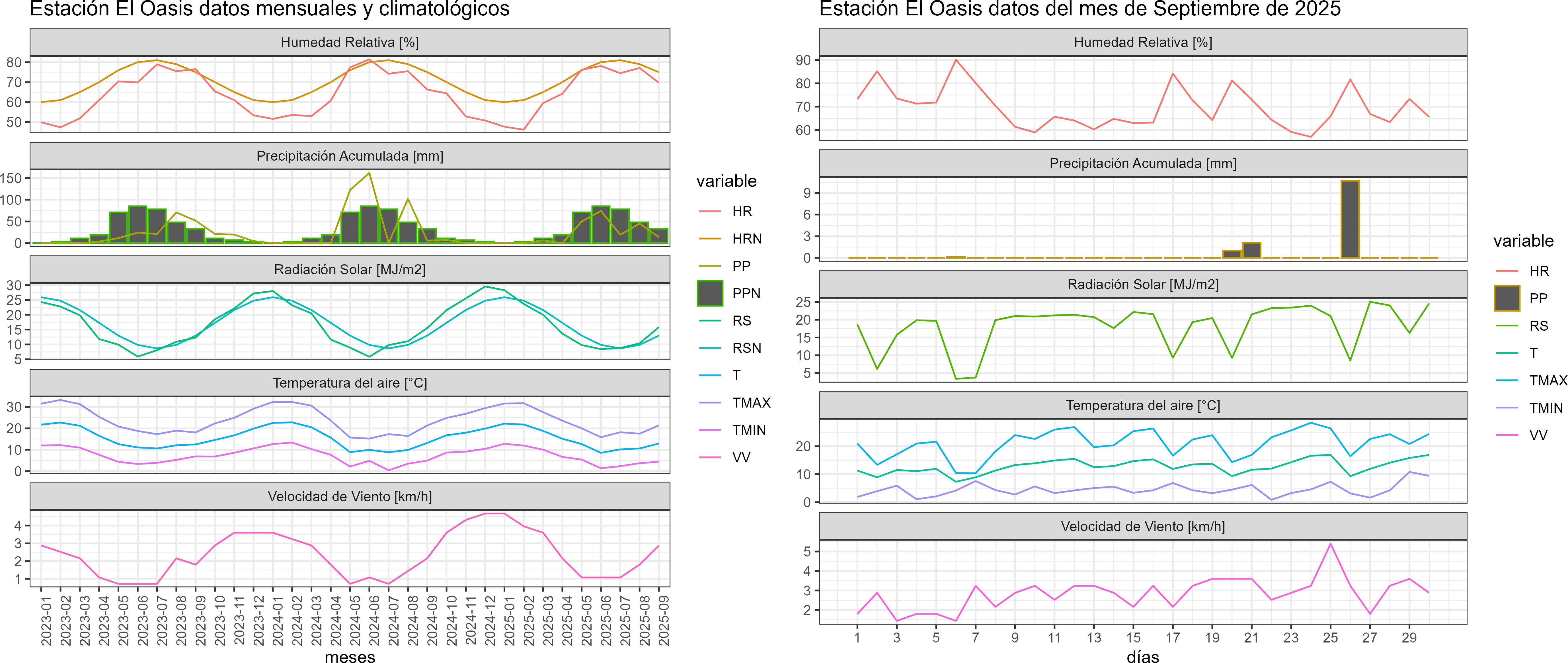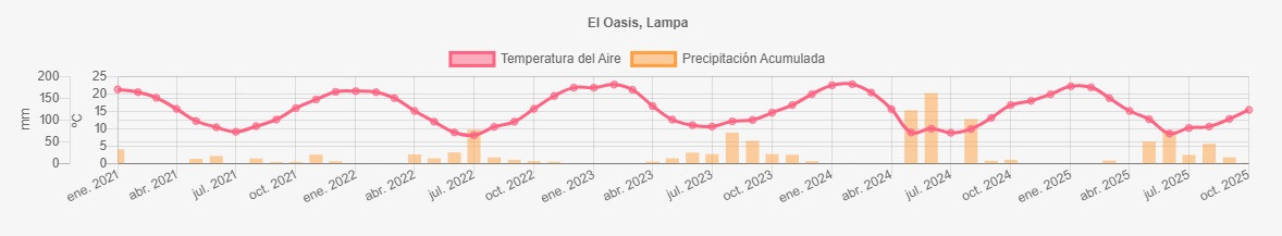 La estación El Oasis corresponde al distrito agroclimático 13-2. Para este distrito climático la temperatura mínima, media y máxima climatológicas alcanzan los 5.2°C, 13.2°C y 21.1°C respectivamente. Por su parte, respecto a las temperaturas medidas durante el mes de septiembre en la estación: la temperatura mínima alcanzo los 4.5°C (-0.7°C bajo la climatológica), la temperatura media 12.8°C (-0.4°C bajo la climatológica) y la temperatura máxima llegó a los 21°C (-0.1°C bajo la climatológica). En el mes de septiembre se registró una pluviometría de 13.9 mm, lo cual representa un 44.8% con respecto al mismo mes de un año normal. De enero a septiembre se ha registrado un total acumulado de 209.3 mm, en circunstancias que un año normal registraría a la fecha 301 mm, lo que representa un déficit de 30.5%. A la misma fecha, durante el año 2024 la precipitación alcanzaba los 5.9 mm.