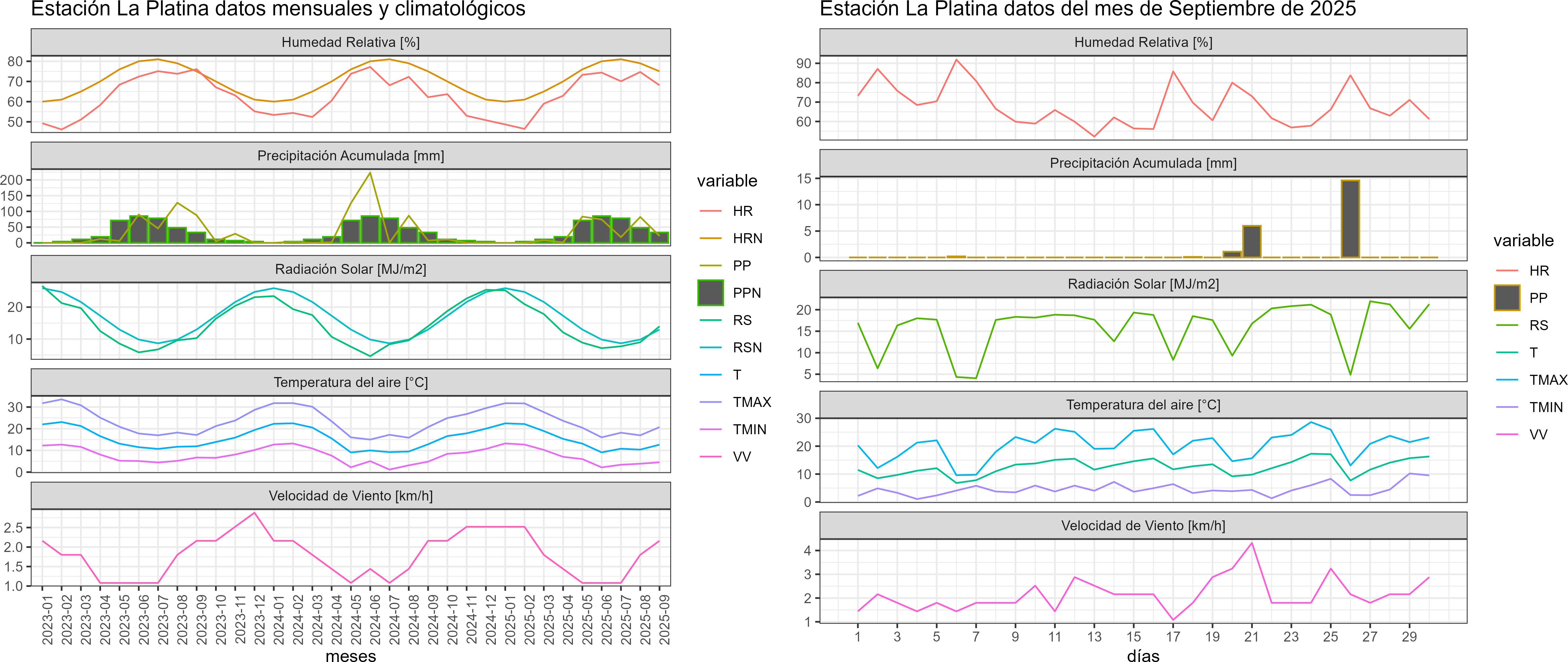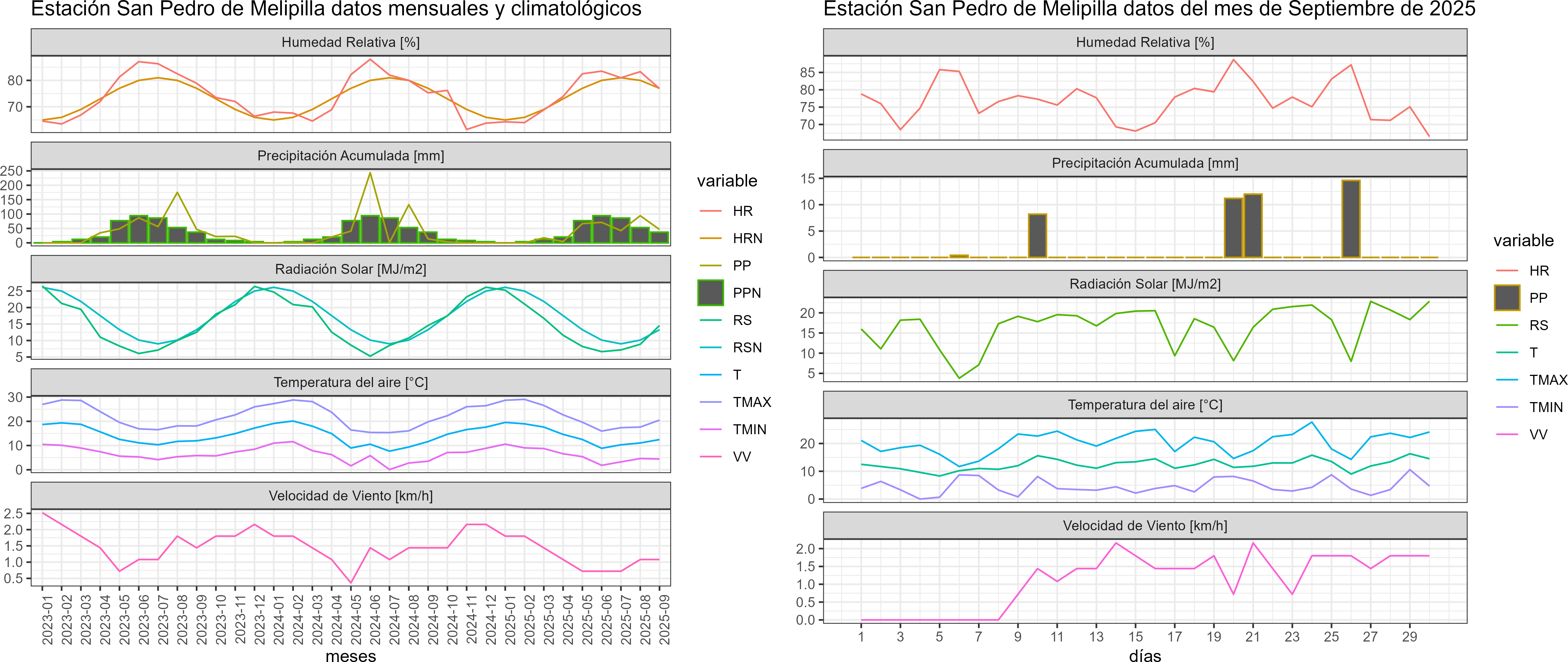 La estación San Pedro de Melipilla corresponde al distrito agroclimático 13-1. Para este distrito climático la temperatura mínima, media y máxima climatológicas alcanzan los 5.1°C, 11.8°C y 18.4°C respectivamente. Por su parte, respecto a las temperaturas medidas durante el mes de septiembre en la estación: la temperatura mínima alcanzo los 4.6°C (-0.5°C bajo la climatológica), la temperatura media 12.4°C (0.6°C sobre la climatológica) y la temperatura máxima llegó a los 20.3°C (1.9°C sobre la climatológica). En el mes de septiembre se registró una pluviometría de 46.4 mm, lo cual representa un 125.4% con respecto al mismo mes de un año normal. De enero a septiembre se ha registrado un total acumulado de 342.9 mm, en circunstancias que un año normal registraría a la fecha 465 mm, lo que representa un déficit de 26.3%. A la misma fecha, durante el año 2024 la precipitación alcanzaba los 13.7 mm.