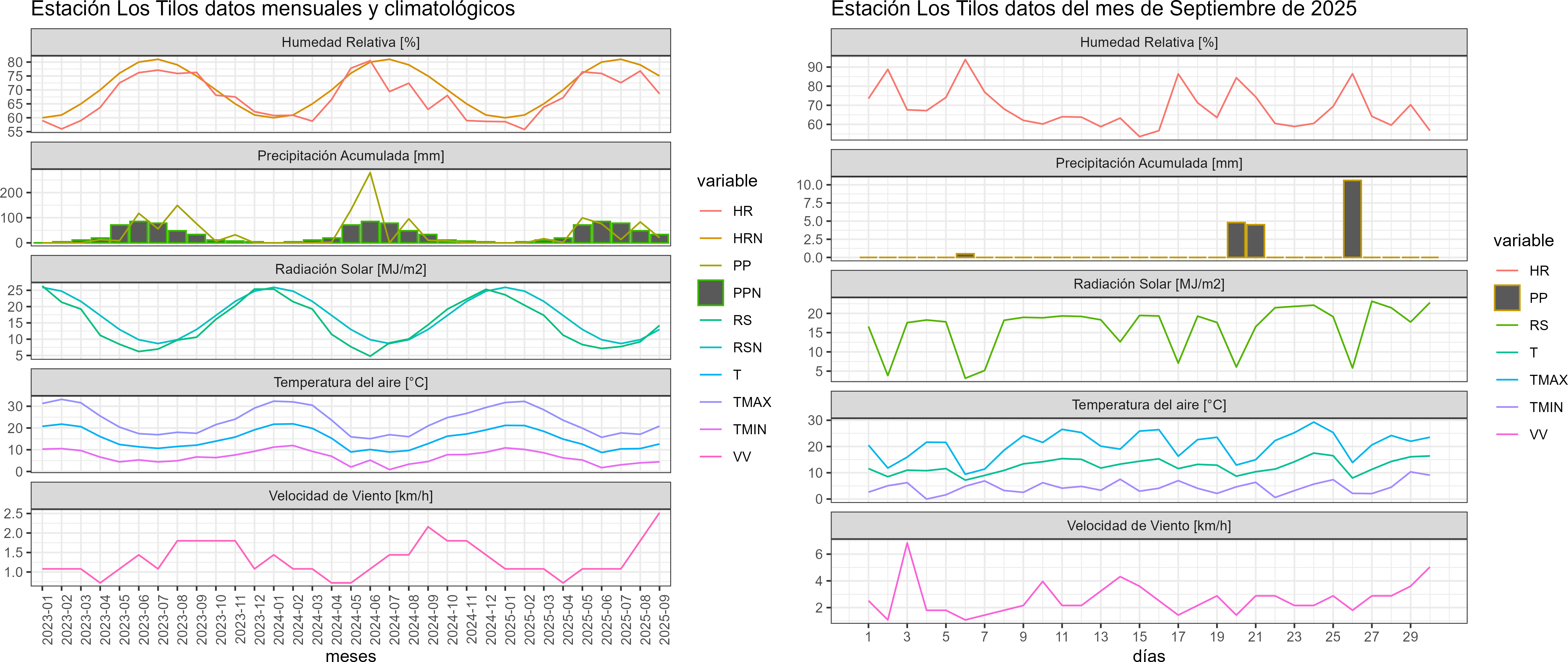 La estación Los Tilos corresponde al distrito agroclimático 13-2. Para este distrito climático la temperatura mínima, media y máxima climatológicas alcanzan los 5.2°C, 13°C y 20.8°C respectivamente. Por su parte, respecto a las temperaturas medidas durante el mes de septiembre en la estación: la temperatura mínima alcanzo los 4.5°C (-0.7°C bajo la climatológica), la temperatura media 12.5°C (-0.5°C bajo la climatológica) y la temperatura máxima llegó a los 20.6°C (-0.2°C bajo la climatológica). En el mes de septiembre se registró una pluviometría de 20.4 mm, lo cual representa un 45.3% con respecto al mismo mes de un año normal. De enero a septiembre se ha registrado un total acumulado de 310.1 mm, en circunstancias que un año normal registraría a la fecha 423 mm, lo que representa un déficit de 26.7%. A la misma fecha, durante el año 2024 la precipitación alcanzaba los 10 mm.