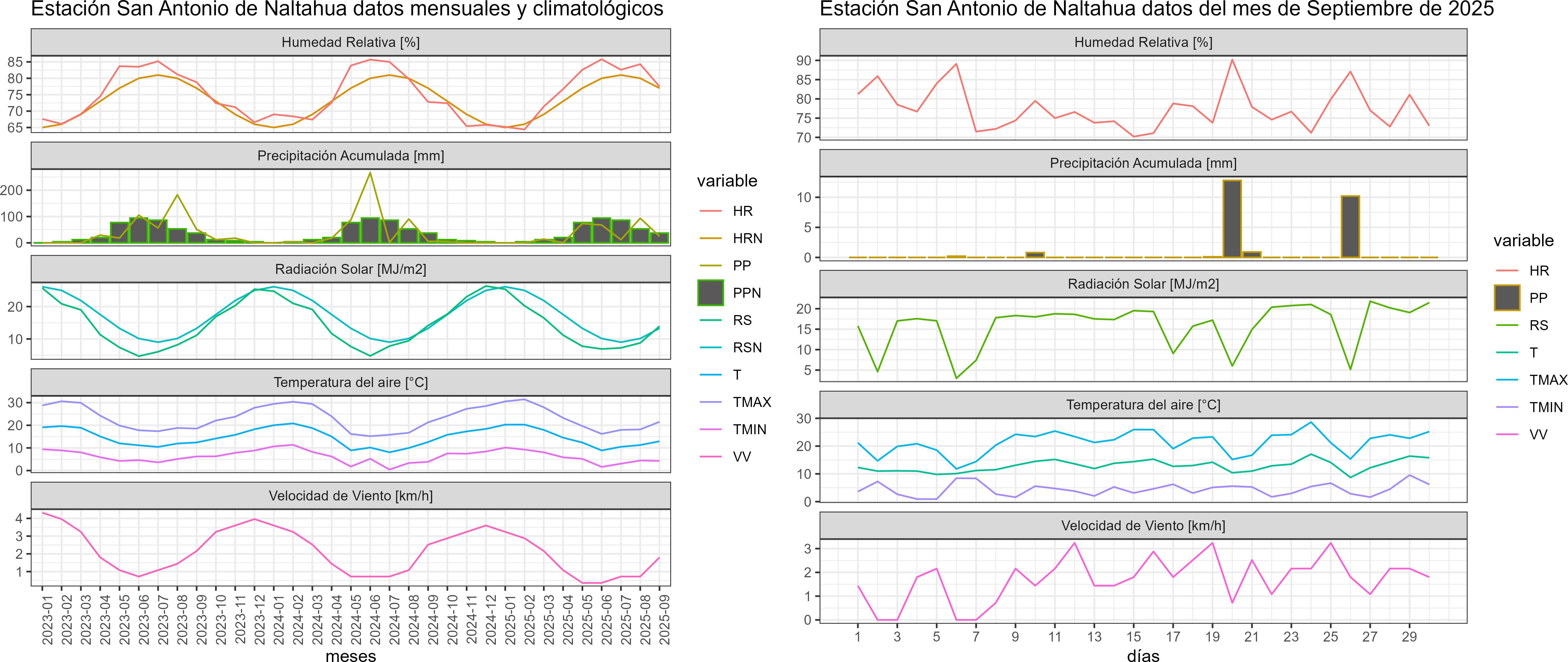 La estación San Antonio de Naltahua corresponde al distrito agroclimático 13-1. Para este distrito climático la temperatura mínima, media y máxima climatológicas alcanzan los 5.3°C, 13°C y 20.7°C respectivamente. Por su parte, respecto a las temperaturas medidas durante el mes de septiembre en la estación: la temperatura mínima alcanzo los 4.4°C (-0.9°C bajo la climatológica), la temperatura media 12.9°C (-0.1°C bajo la climatológica) y la temperatura máxima llegó a los 21.3°C (0.6°C sobre la climatológica). En el mes de septiembre se registró una pluviometría de 25 mm, lo cual representa un 67.6% con respecto al mismo mes de un año normal. De enero a septiembre se ha registrado un total acumulado de 286.1 mm, en circunstancias que un año normal registraría a la fecha 440 mm, lo que representa un déficit de 35%. A la misma fecha, durante el año 2024 la precipitación alcanzaba los 5.9 mm.