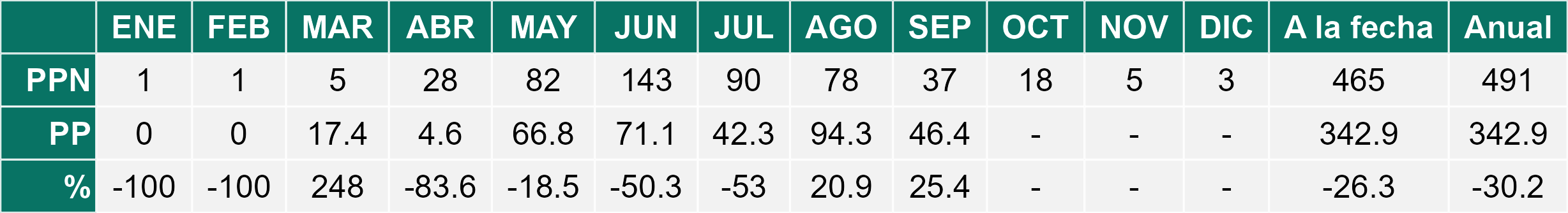 Durante el mes de Septiembre 2025 se registraron precipitaciones efectivas con un promedio regional acumulado de 304 mm. Registro 34 mm por sobre el mes anterior.
