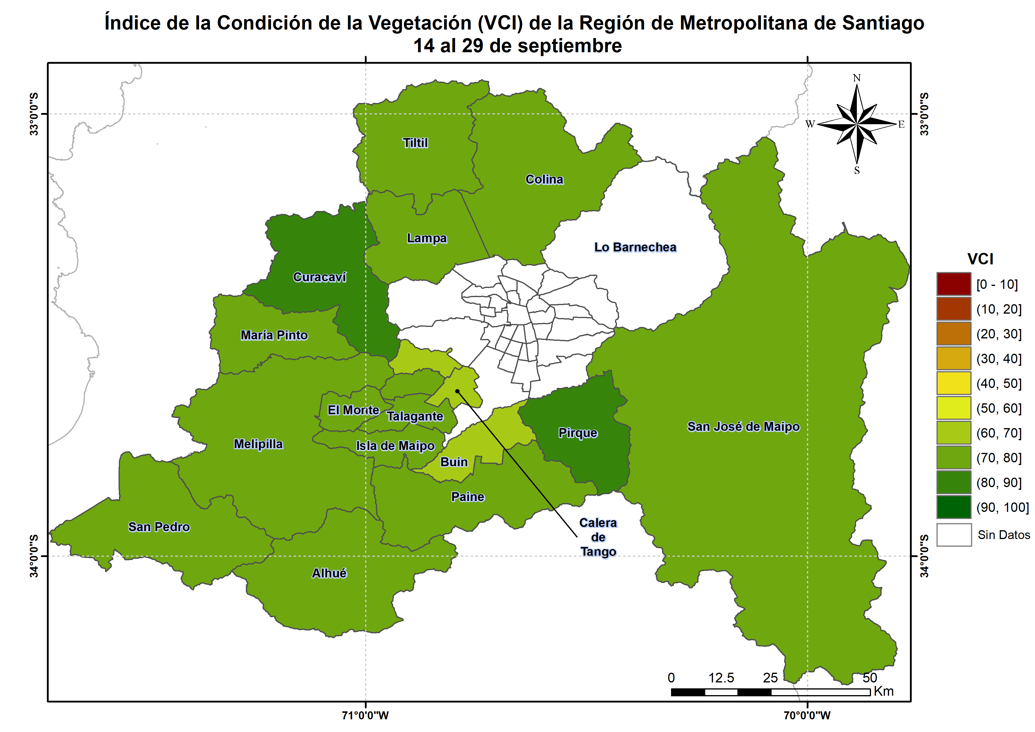 En el detalle comunal los valores más bajos del índice VCI en la Región corresponden a Buin, Calera de Tango, Padre Hurtado, Peñaflor y Colina con 67, 68, 69, 72 y 73% de VCI respectivamente.