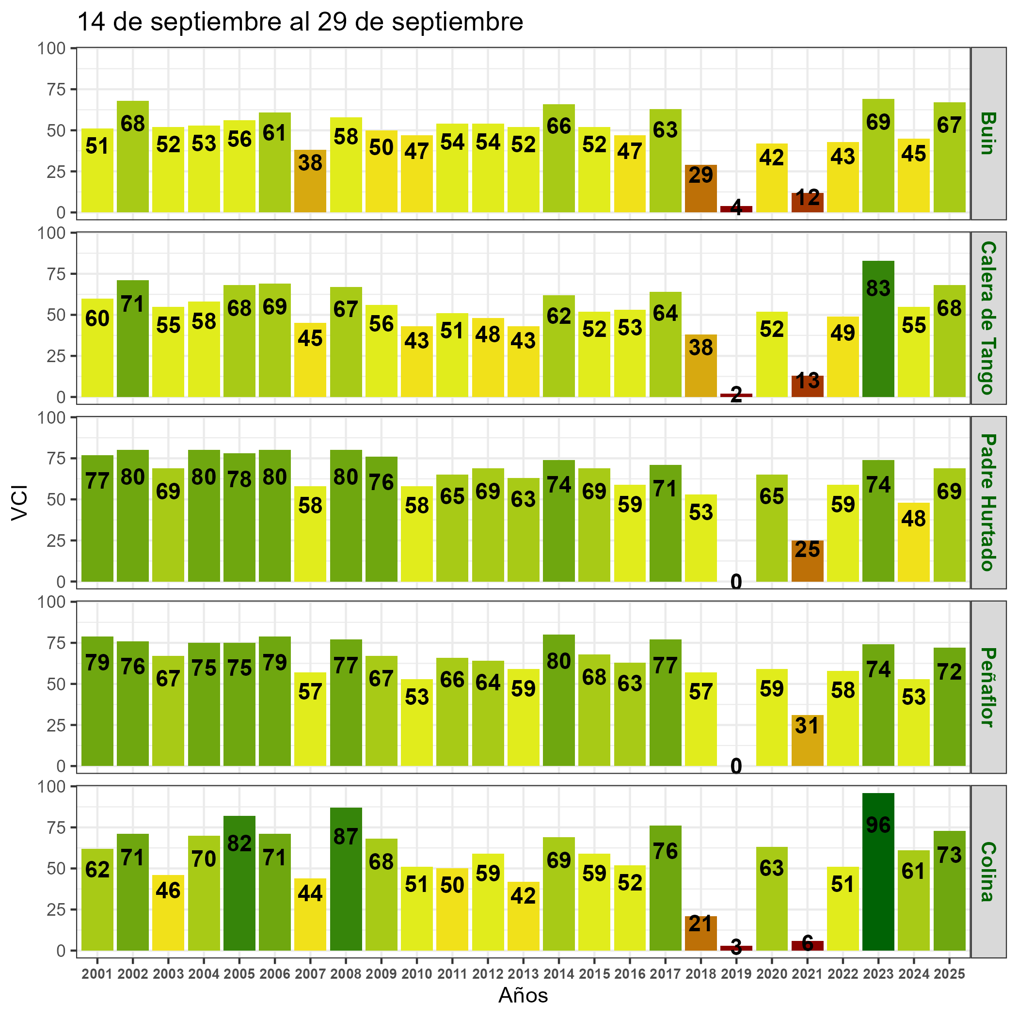 En términos globales la Región presentó un valor mediano de VCI de 75% para el período comprendido desde el 14 al 29 de septiembre. A igual período del año pasado presentaba un VCI de 59% (Fig. 1). De acuerdo a la Tabla 1 la Región Metropolitana, en términos globales presenta una condición Favorable.