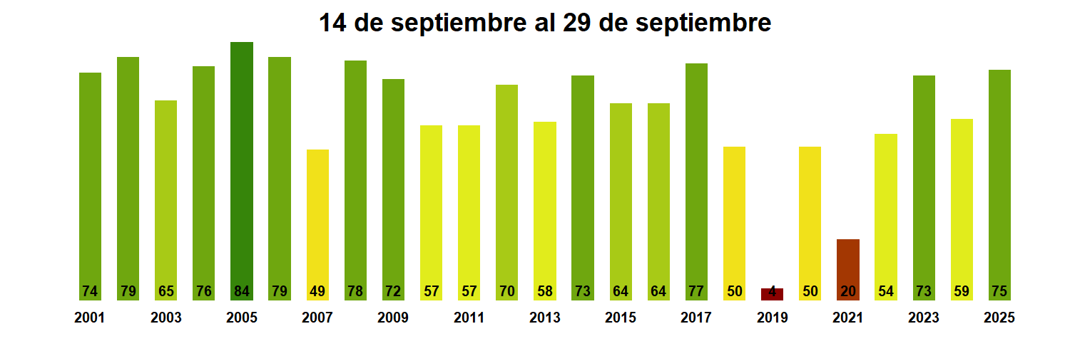 Se aprecia en el indicador de Indice de Condición de la Vegetación (VCI) el cual indica un valor mediano de VCI de 75% para el período comprendido desde el 14 al 29 de Septiembre 2025 para la Región Metropolitana ; lo cual indica una condición favorable .