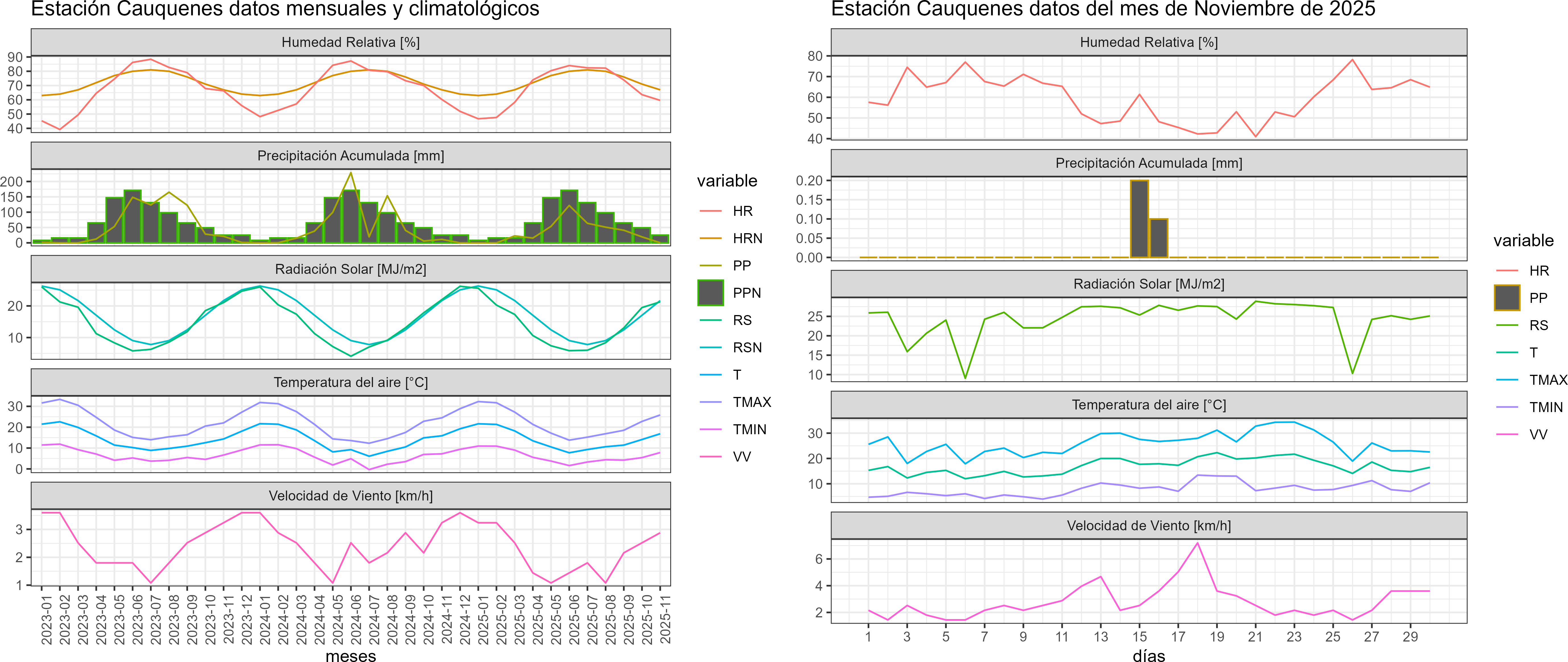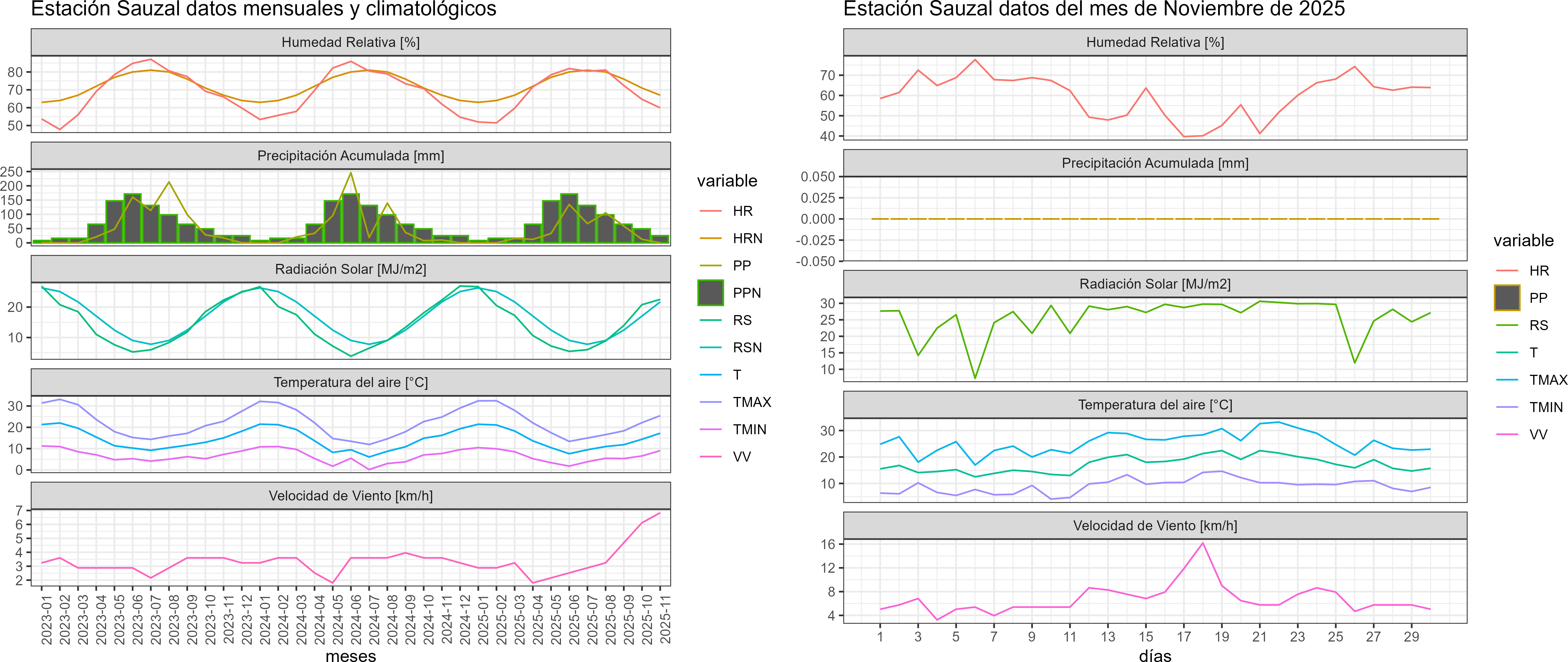 La estación Sauzal corresponde al distrito agroclimático 7-8-3. Para este distrito climático la temperatura mínima, media y máxima climatológicas alcanzan los 7.7°C, 16.5°C y 25.2°C respectivamente. Por su parte, respecto a las temperaturas medidas durante el mes de noviembre en la estación: la temperatura mínima alcanzo los 9.1°C (1.4°C sobre la climatológica), la temperatura media 17.2°C (0.7°C sobre la climatológica) y la temperatura máxima llegó a los 25.4°C (0.2°C sobre la climatológica). En el mes de noviembre se registró una pluviometría de 0 mm, lo cual representa un 0% con respecto al mismo mes de un año normal. De enero a noviembre se ha registrado un total acumulado de 438.7 mm, en circunstancias que un año normal registraría a la fecha 665 mm, lo que representa un déficit de 34%. A la misma fecha, durante el año 2024 la precipitación alcanzaba los 10 mm.
