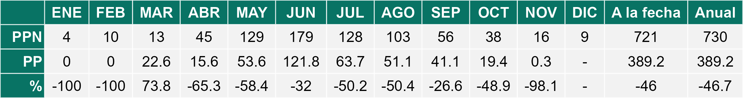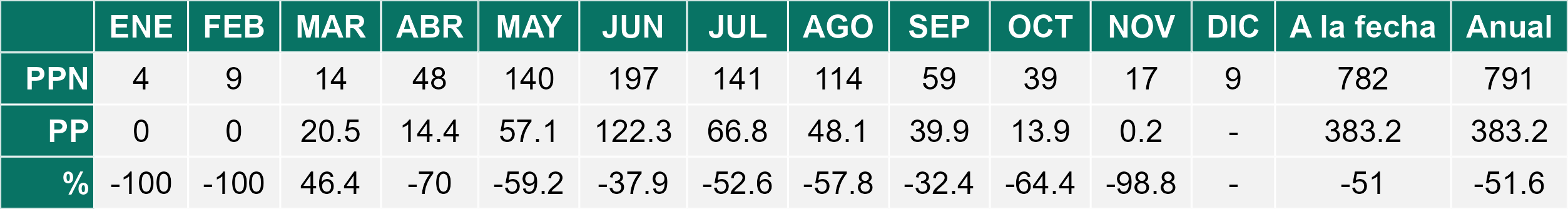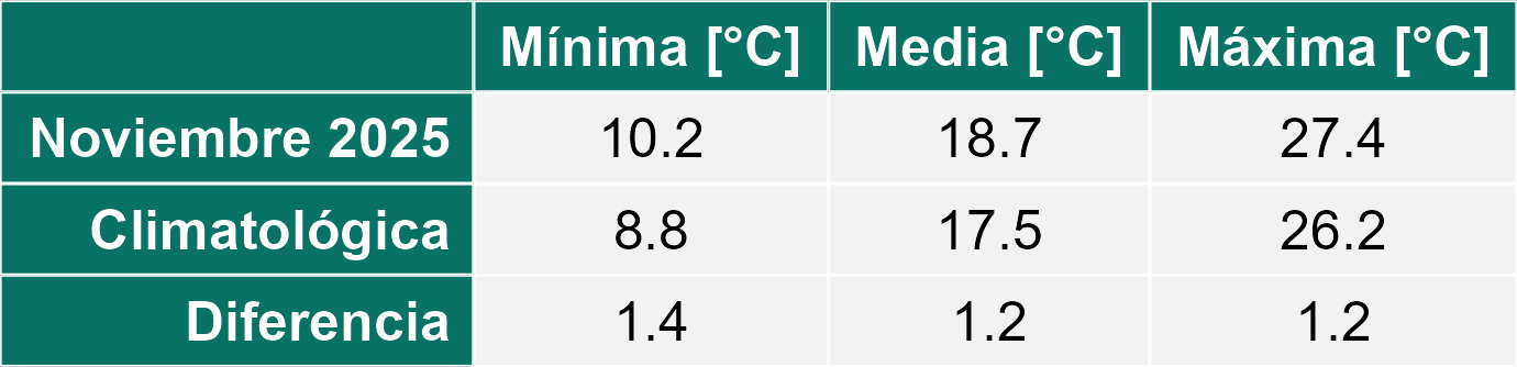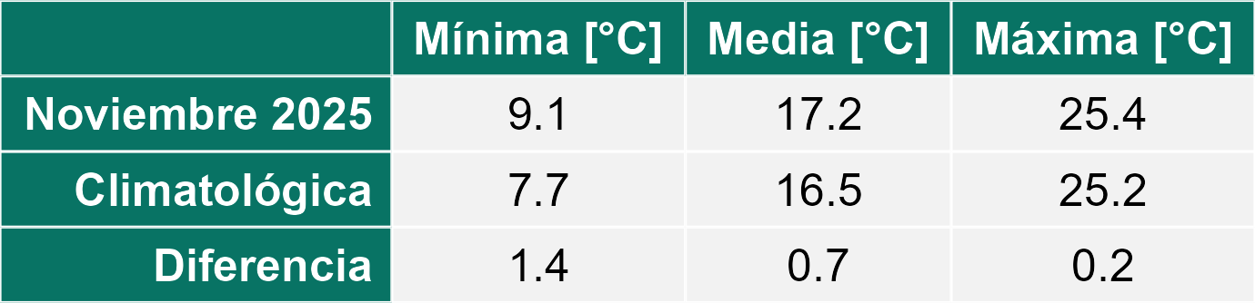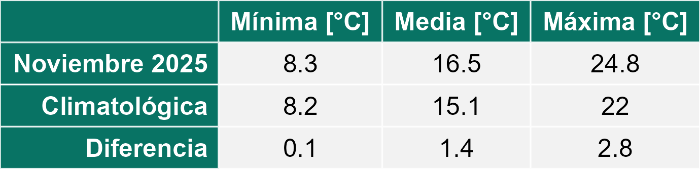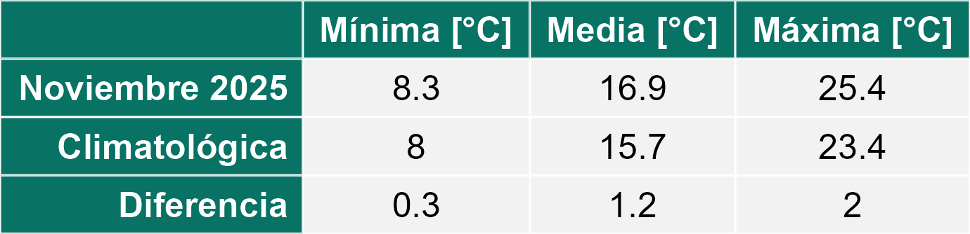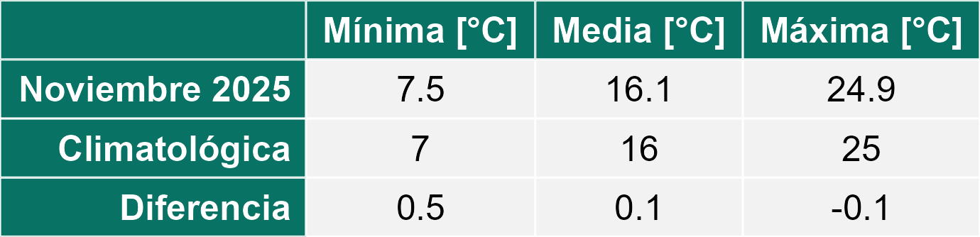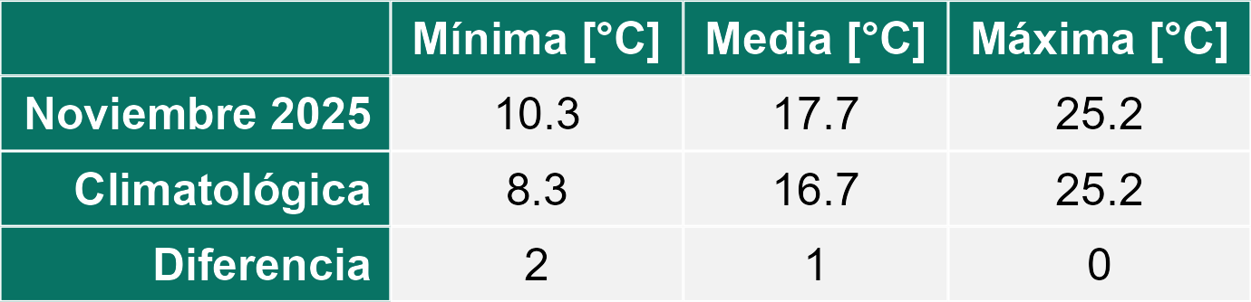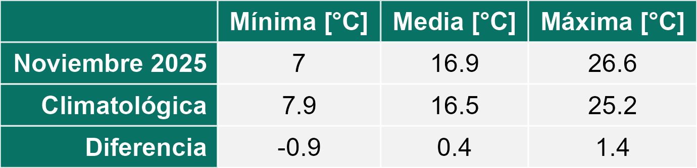 La estación Miraflores corresponde al distrito agroclimático 7-8-4. Para este distrito climático la temperatura mínima, media y máxima climatológicas alcanzan los 8.8°C, 17.5°C y 26.2°C respectivamente. Por su parte, respecto a las temperaturas medidas durante el mes de noviembre en la estación: la temperatura mínima alcanzo los 10.2°C (1.4°C sobre la climatológica), la temperatura media 18.7°C (1.2°C sobre la climatológica) y la temperatura máxima llegó a los 27.4°C (1.2°C sobre la climatológica). En el mes de noviembre se registró una pluviometría de 0.1 mm, lo cual representa un 0.7% con respecto al mismo mes de un año normal. De enero a noviembre se ha registrado un total acumulado de 556.5 mm, en circunstancias que un año normal registraría a la fecha 765 mm, lo que representa un déficit de 27.3%. A la misma fecha, durante el año 2024 la precipitación alcanzaba los 5.6 mm.