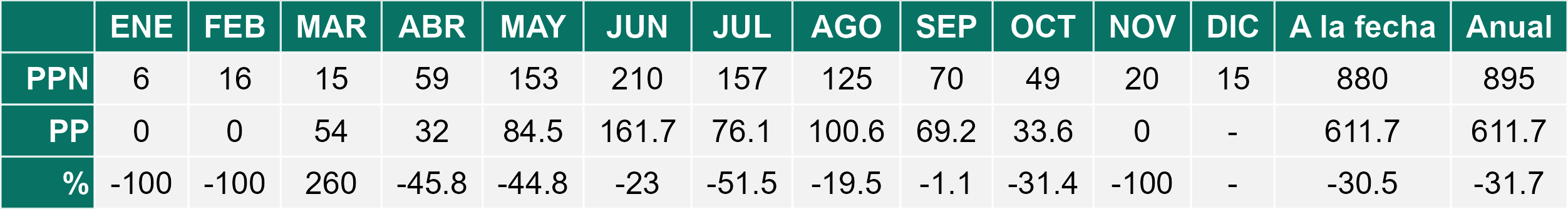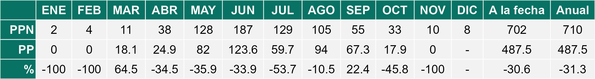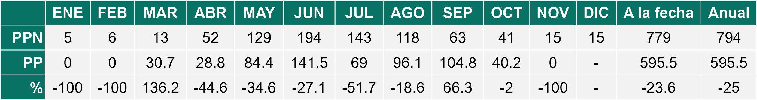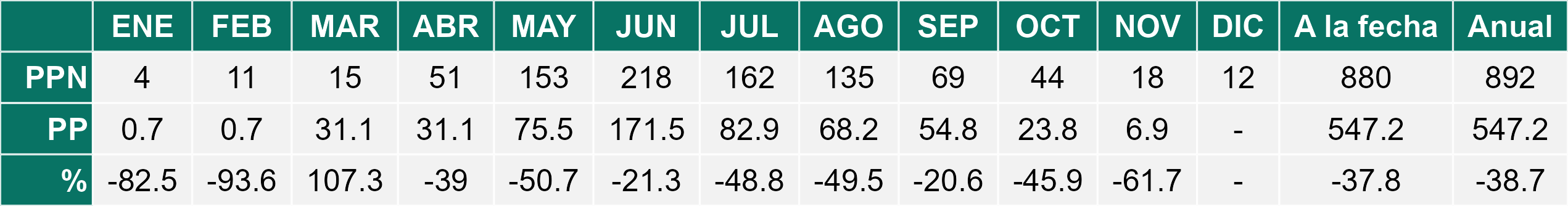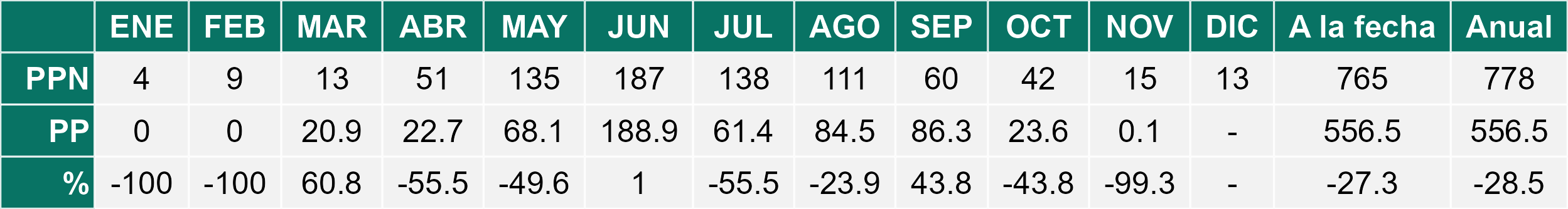 La estación Miraflores corresponde al distrito agroclimático 7-8-4. Para este distrito climático la temperatura mínima, media y máxima climatológicas alcanzan los 8.8°C, 17.5°C y 26.2°C respectivamente. Por su parte, respecto a las temperaturas medidas durante el mes de noviembre en la estación: la temperatura mínima alcanzo los 10.2°C (1.4°C sobre la climatológica), la temperatura media 18.7°C (1.2°C sobre la climatológica) y la temperatura máxima llegó a los 27.4°C (1.2°C sobre la climatológica). En el mes de noviembre se registró una pluviometría de 0.1 mm, lo cual representa un 0.7% con respecto al mismo mes de un año normal. De enero a noviembre se ha registrado un total acumulado de 556.5 mm, en circunstancias que un año normal registraría a la fecha 765 mm, lo que representa un déficit de 27.3%. A la misma fecha, durante el año 2024 la precipitación alcanzaba los 5.6 mm.