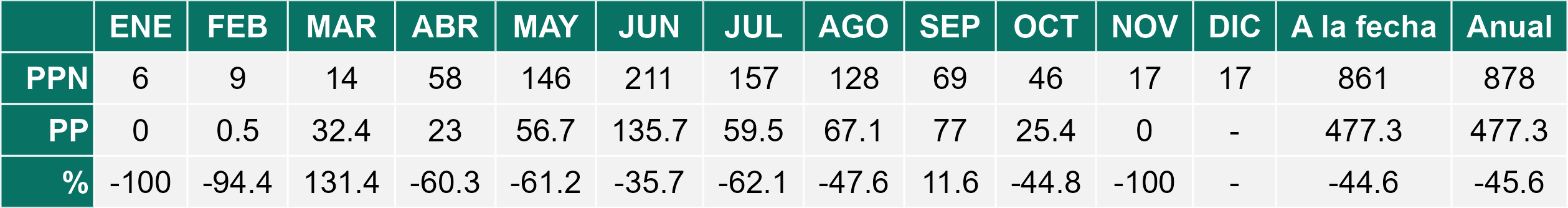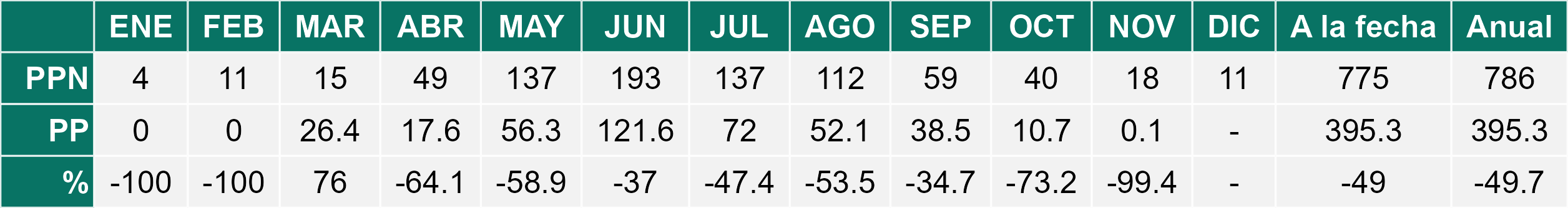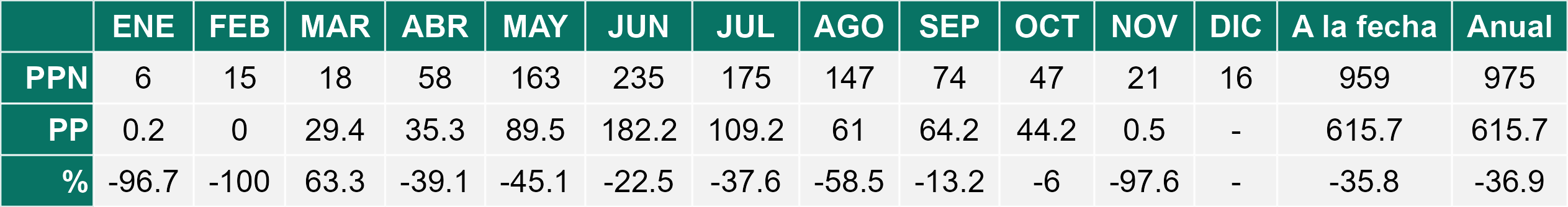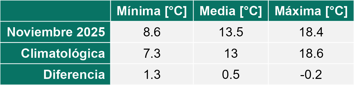 La estación Lomas corresponde al distrito agroclimático 7-8-1. Para este distrito climático la temperatura mínima, media y máxima climatológicas alcanzan los 8.4°C, 13.2°C y 18.1°C respectivamente. Por su parte, respecto a las temperaturas medidas durante el mes de noviembre en la estación: la temperatura mínima alcanzo los 8°C (-0.4°C bajo la climatológica), la temperatura media 13.6°C (0.4°C sobre la climatológica) y la temperatura máxima llegó a los 19.3°C (1.2°C sobre la climatológica). En el mes de noviembre se registró una pluviometría de 0.5 mm, lo cual representa un 2.4% con respecto al mismo mes de un año normal. De enero a noviembre se ha registrado un total acumulado de 615.7 mm, en circunstancias que un año normal registraría a la fecha 959 mm, lo que representa un déficit de 35.8%. A la misma fecha, durante el año 2024 la precipitación alcanzaba los 31.1 mm.