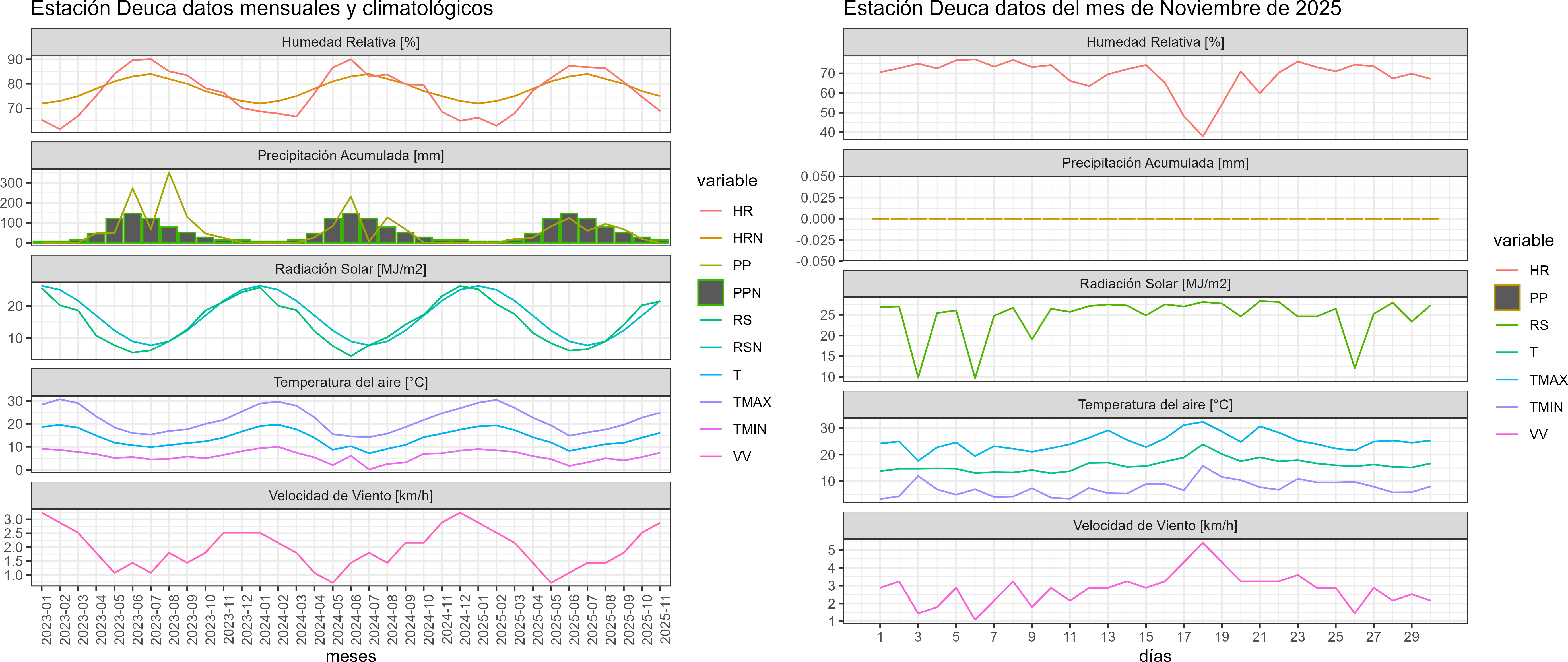 La estación Deuca corresponde al distrito agroclimático 6-7-1. Para este distrito climático la temperatura mínima, media y máxima climatológicas alcanzan los 7°C, 16°C y 25°C respectivamente. Por su parte, respecto a las temperaturas medidas durante el mes de noviembre en la estación: la temperatura mínima alcanzo los 7.5°C (0.5°C sobre la climatológica), la temperatura media 16.1°C (0.1°C sobre la climatológica) y la temperatura máxima llegó a los 24.9°C (-0.1°C bajo la climatológica). En el mes de noviembre se registró una pluviometría de 0 mm, lo cual representa un 0% con respecto al mismo mes de un año normal. De enero a noviembre se ha registrado un total acumulado de 487.5 mm, en circunstancias que un año normal registraría a la fecha 702 mm, lo que representa un déficit de 30.6%. A la misma fecha, durante el año 2024 la precipitación alcanzaba los 0.4 mm.