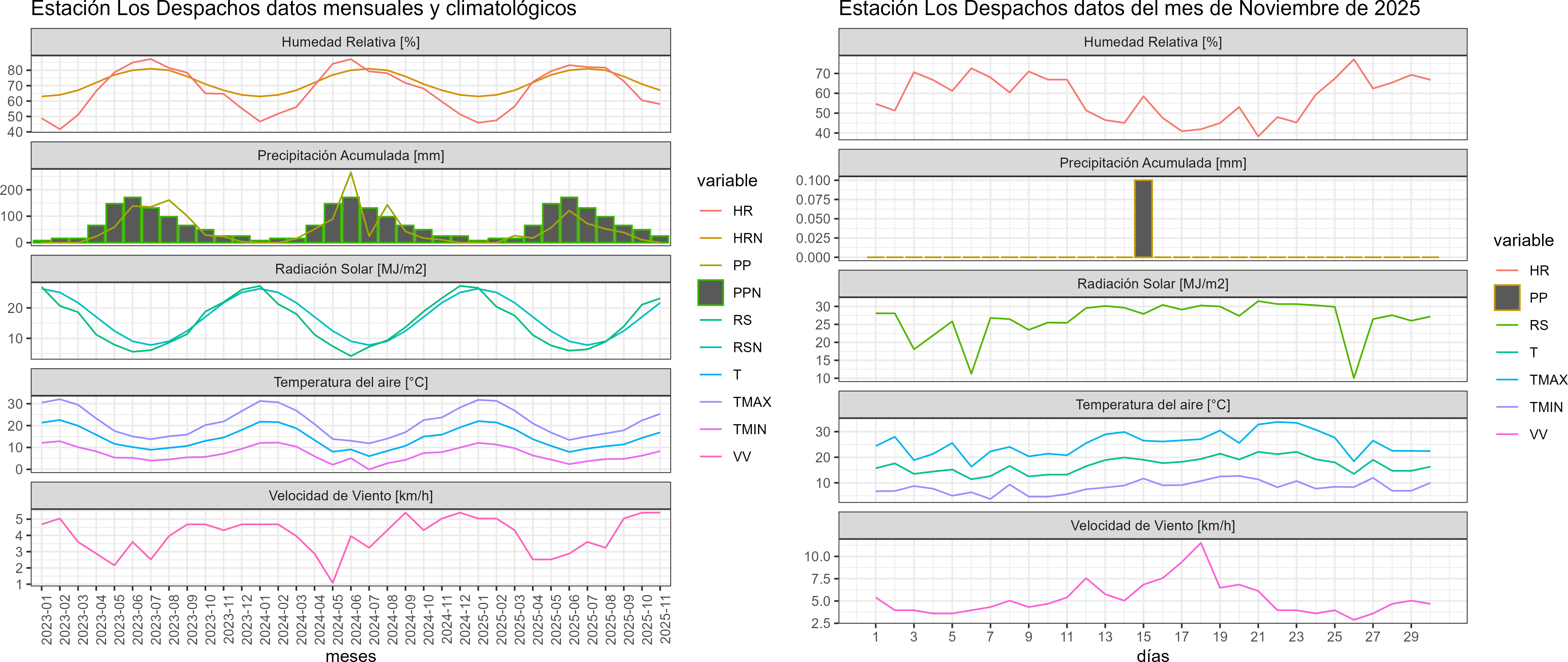 La estación Los Despachos corresponde al distrito agroclimático 7-8-3. Para este distrito climático la temperatura mínima, media y máxima climatológicas alcanzan los 8°C, 15.7°C y 23.4°C respectivamente. Por su parte, respecto a las temperaturas medidas durante el mes de noviembre en la estación: la temperatura mínima alcanzo los 8.3°C (0.3°C sobre la climatológica), la temperatura media 16.9°C (1.2°C sobre la climatológica) y la temperatura máxima llegó a los 25.4°C (2°C sobre la climatológica). En el mes de noviembre se registró una pluviometría de 0.1 mm, lo cual representa un 0.6% con respecto al mismo mes de un año normal. De enero a noviembre se ha registrado un total acumulado de 395.3 mm, en circunstancias que un año normal registraría a la fecha 775 mm, lo que representa un déficit de 49%. A la misma fecha, durante el año 2024 la precipitación alcanzaba los 11.1 mm.
