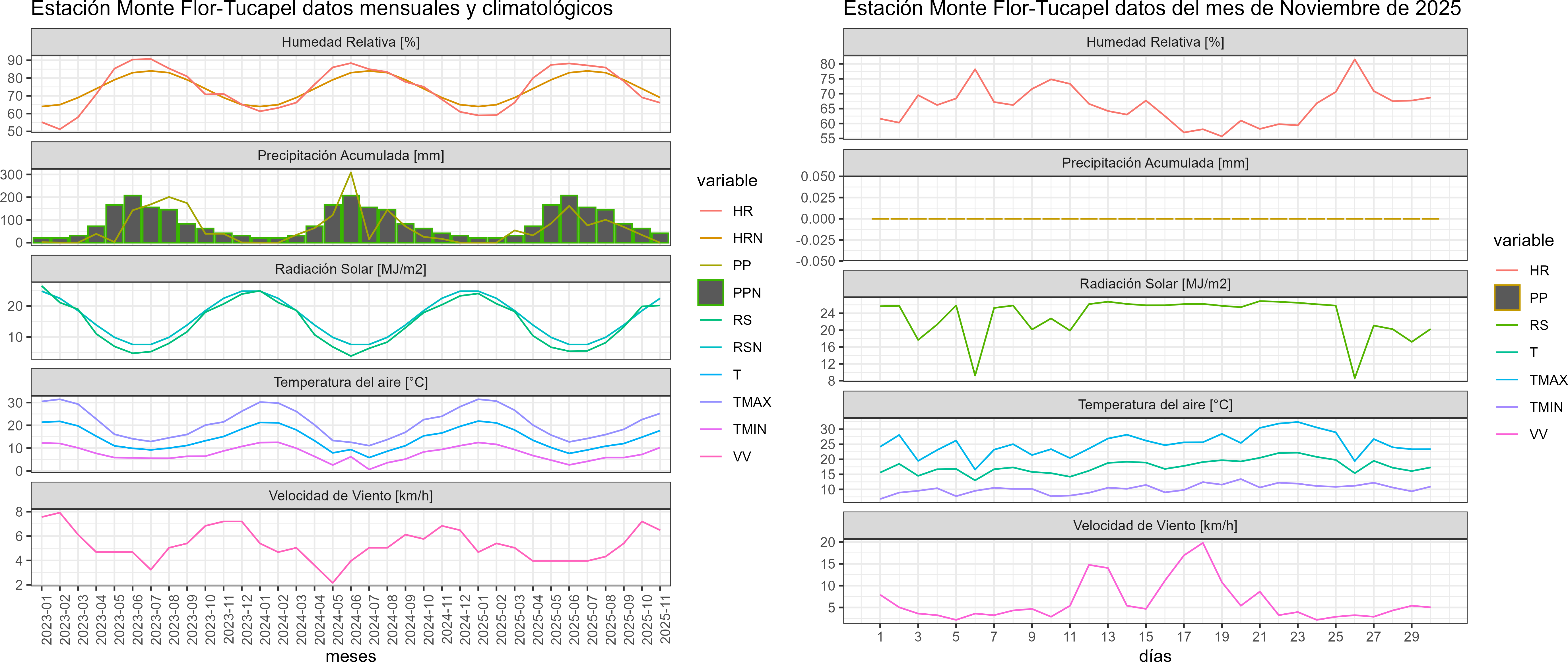 La estación Monte Flor-Tucapel corresponde al distrito agroclimático 7-9-1. Para este distrito climático la temperatura mínima, media y máxima climatológicas alcanzan los 8.3°C, 16.7°C y 25.2°C respectivamente. Por su parte, respecto a las temperaturas medidas durante el mes de noviembre en la estación: la temperatura mínima alcanzo los 10.3°C (2°C sobre la climatológica), la temperatura media 17.7°C (1°C sobre la climatológica) y la temperatura máxima llegó a los 25.2°C (Igual la climatológico). En el mes de noviembre se registró una pluviometría de 0 mm, lo cual representa un 0% con respecto al mismo mes de un año normal. De enero a noviembre se ha registrado un total acumulado de 611.7 mm, en circunstancias que un año normal registraría a la fecha 880 mm, lo que representa un déficit de 30.5%. A la misma fecha, durante el año 2024 la precipitación alcanzaba los 16.6 mm.
