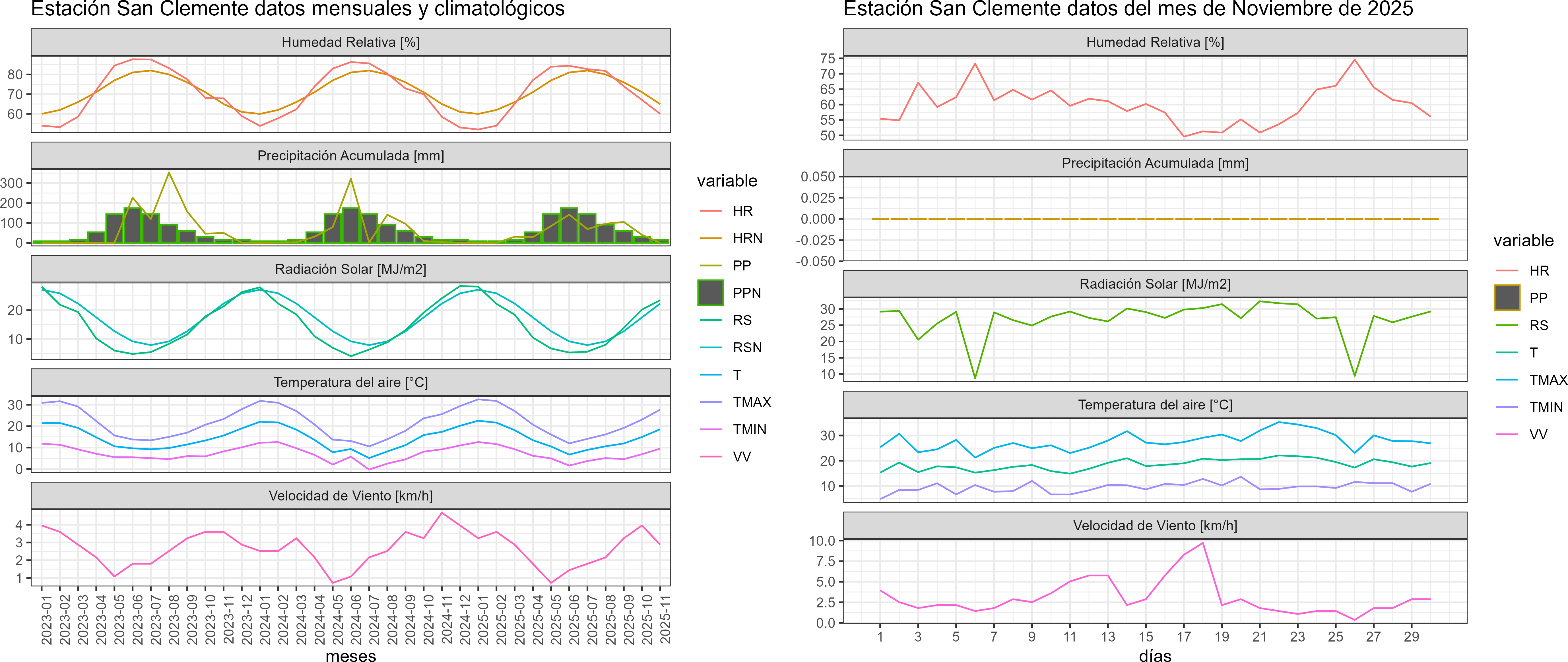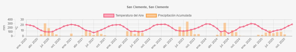 La estación San Clemente corresponde al distrito agroclimático 6-7-4. Para este distrito climático la temperatura mínima, media y máxima climatológicas alcanzan los 8.2°C, 17.2°C y 26.1°C respectivamente. Por su parte, respecto a las temperaturas medidas durante el mes de noviembre en la estación: la temperatura mínima alcanzo los 9.5°C (1.3°C sobre la climatológica), la temperatura media 18.6°C (1.4°C sobre la climatológica) y la temperatura máxima llegó a los 27.8°C (1.7°C sobre la climatológica). En el mes de noviembre se registró una pluviometría de 0 mm, lo cual representa un 0% con respecto al mismo mes de un año normal. De enero a noviembre se ha registrado un total acumulado de 595.5 mm, en circunstancias que un año normal registraría a la fecha 779 mm, lo que representa un déficit de 23.6%. A la misma fecha, durante el año 2024 la precipitación alcanzaba los 3.8 mm.