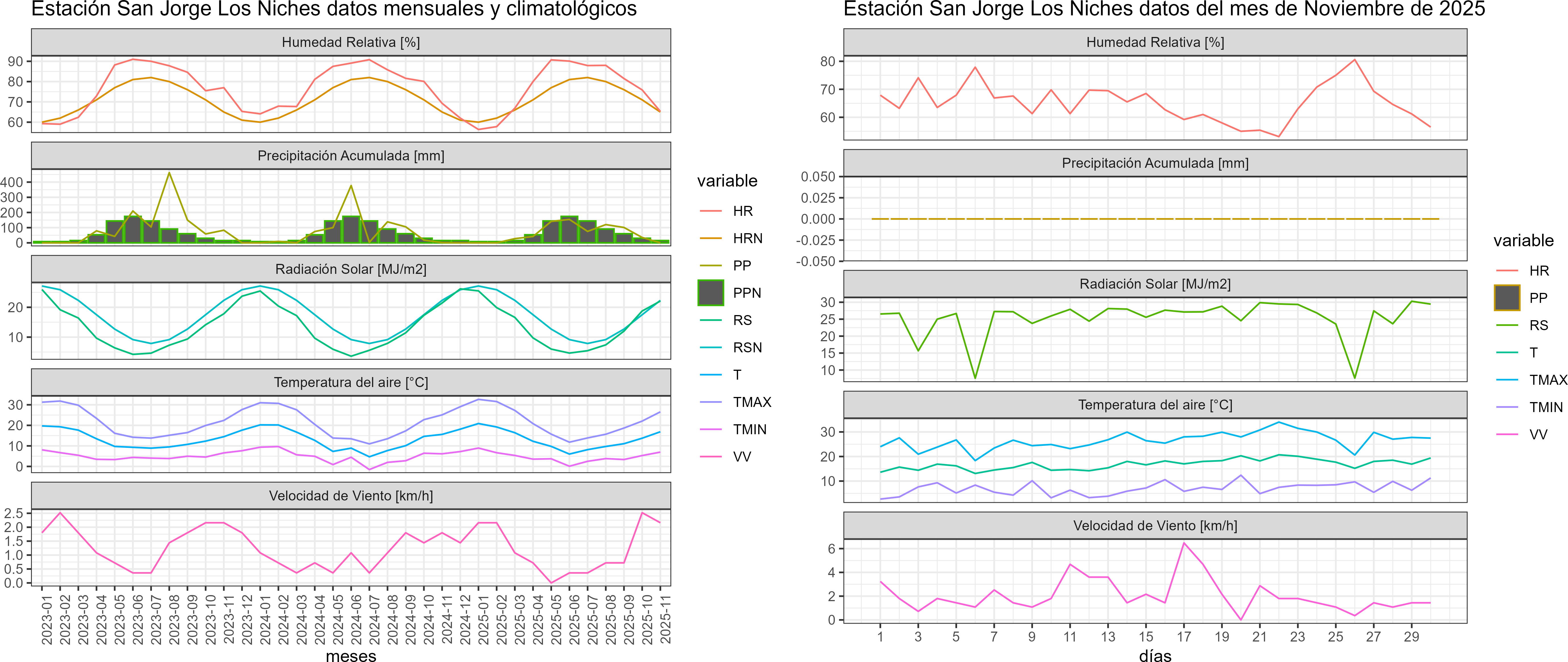La estación San Jorge Los Niches corresponde al distrito agroclimático 6-7-4. Para este distrito climático la temperatura mínima, media y máxima climatológicas alcanzan los 7.9°C, 16.5°C y 25.2°C respectivamente. Por su parte, respecto a las temperaturas medidas durante el mes de noviembre en la estación: la temperatura mínima alcanzo los 7°C (-0.9°C bajo la climatológica), la temperatura media 16.9°C (0.4°C sobre la climatológica) y la temperatura máxima llegó a los 26.6°C (1.4°C sobre la climatológica). En el mes de noviembre se registró una pluviometría de 0 mm, lo cual representa un 0% con respecto al mismo mes de un año normal. De enero a noviembre se ha registrado un total acumulado de 697.2 mm, en circunstancias que un año normal registraría a la fecha 811 mm, lo que representa un déficit de 14%. A la misma fecha, durante el año 2024 la precipitación alcanzaba los 1.3 mm.