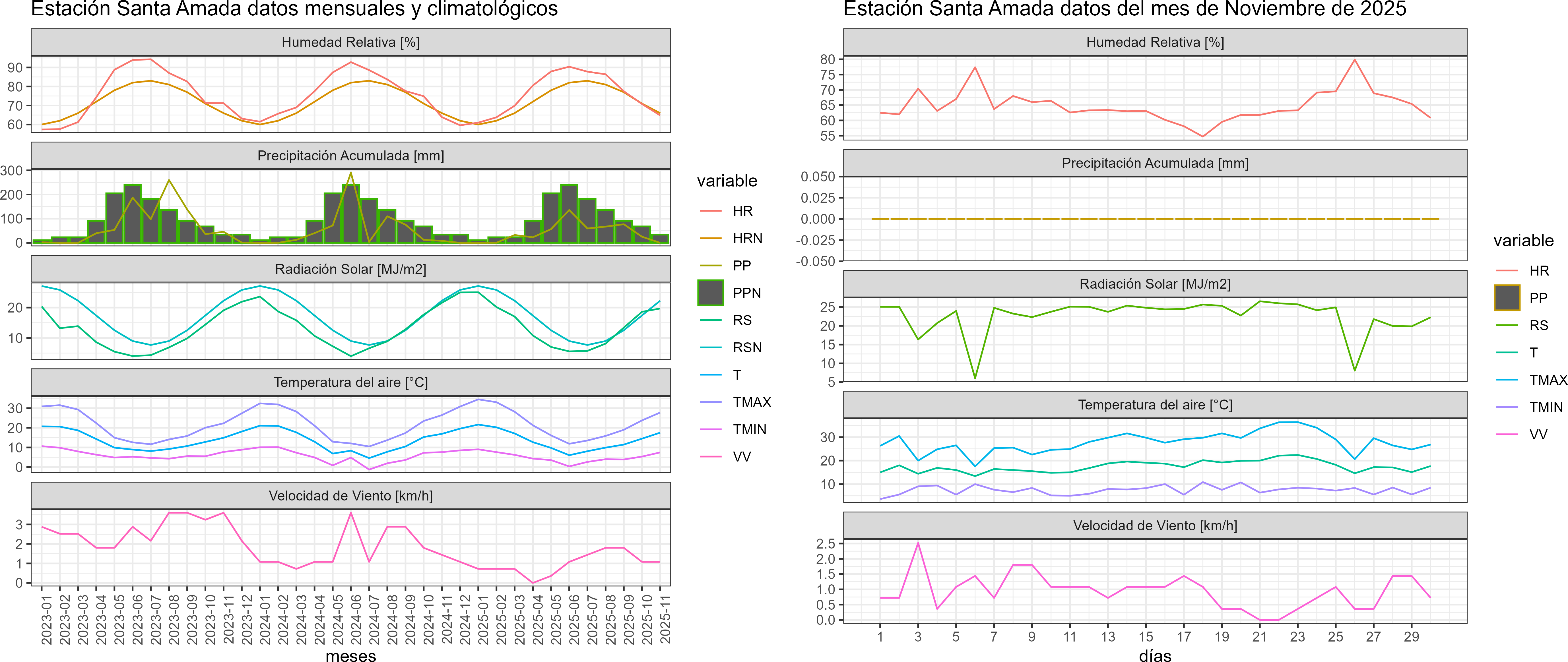La estación Santa Amada corresponde al distrito agroclimático 7-8-5. Para este distrito climático la temperatura mínima, media y máxima climatológicas alcanzan los 7.9°C, 16.8°C y 25.8°C respectivamente. Por su parte, respecto a las temperaturas medidas durante el mes de noviembre en la estación: la temperatura mínima alcanzo los 7.5°C (-0.4°C bajo la climatológica), la temperatura media 17.5°C (0.7°C sobre la climatológica) y la temperatura máxima llegó a los 27.8°C (2°C sobre la climatológica). En el mes de noviembre se registró una pluviometría de 0 mm, lo cual representa un 0% con respecto al mismo mes de un año normal. De enero a noviembre se ha registrado un total acumulado de 477.3 mm, en circunstancias que un año normal registraría a la fecha 861 mm, lo que representa un déficit de 44.6%. A la misma fecha, durante el año 2024 la precipitación alcanzaba los 8.2 mm.