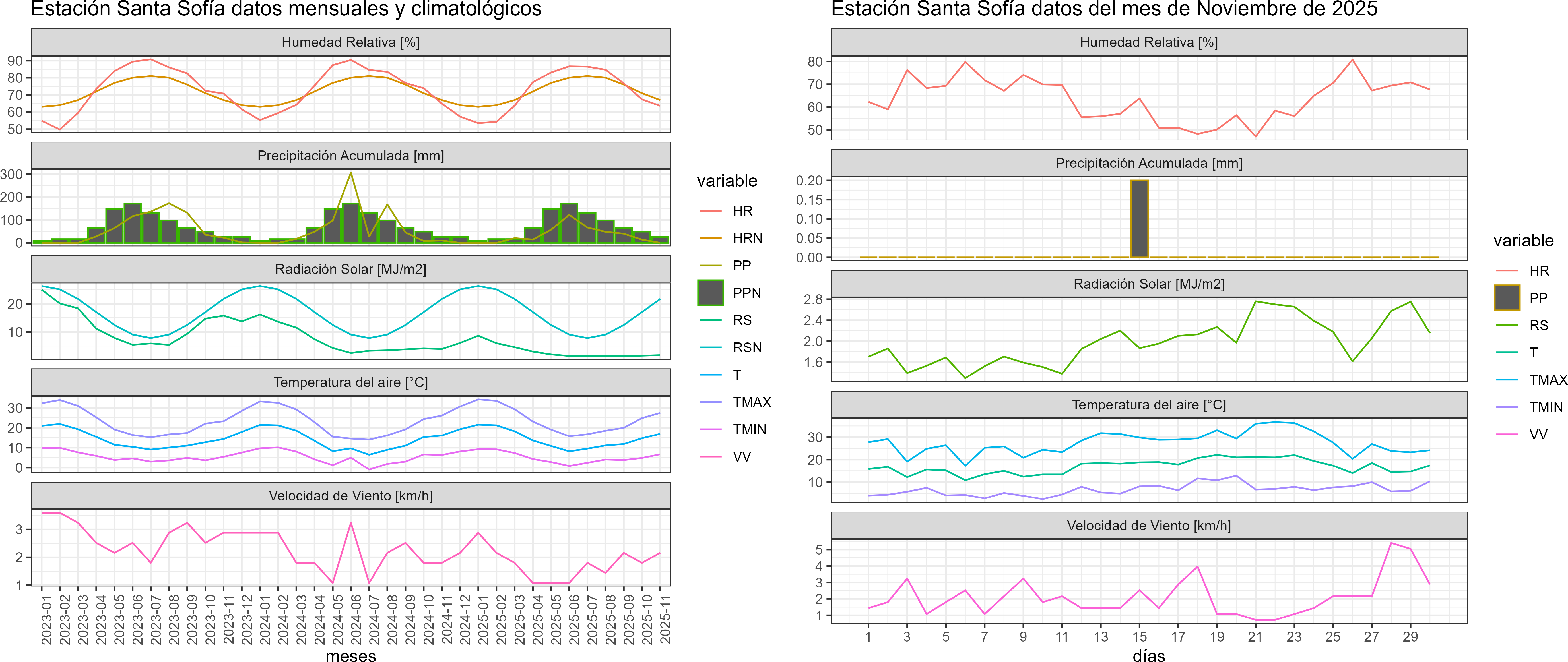 La estación Santa Sofía corresponde al distrito agroclimático 7-8-3. Para este distrito climático la temperatura mínima, media y máxima climatológicas alcanzan los 7.8°C, 15.4°C y 23°C respectivamente. Por su parte, respecto a las temperaturas medidas durante el mes de noviembre en la estación: la temperatura mínima alcanzo los 6.7°C (-1.1°C bajo la climatológica), la temperatura media 16.9°C (1.5°C sobre la climatológica) y la temperatura máxima llegó a los 27.4°C (4.4°C sobre la climatológica). En el mes de noviembre se registró una pluviometría de 0.2 mm, lo cual representa un 1.2% con respecto al mismo mes de un año normal. De enero a noviembre se ha registrado un total acumulado de 383.2 mm, en circunstancias que un año normal registraría a la fecha 782 mm, lo que representa un déficit de 51%. A la misma fecha, durante el año 2024 la precipitación alcanzaba los 9.9 mm.
