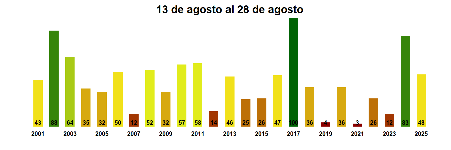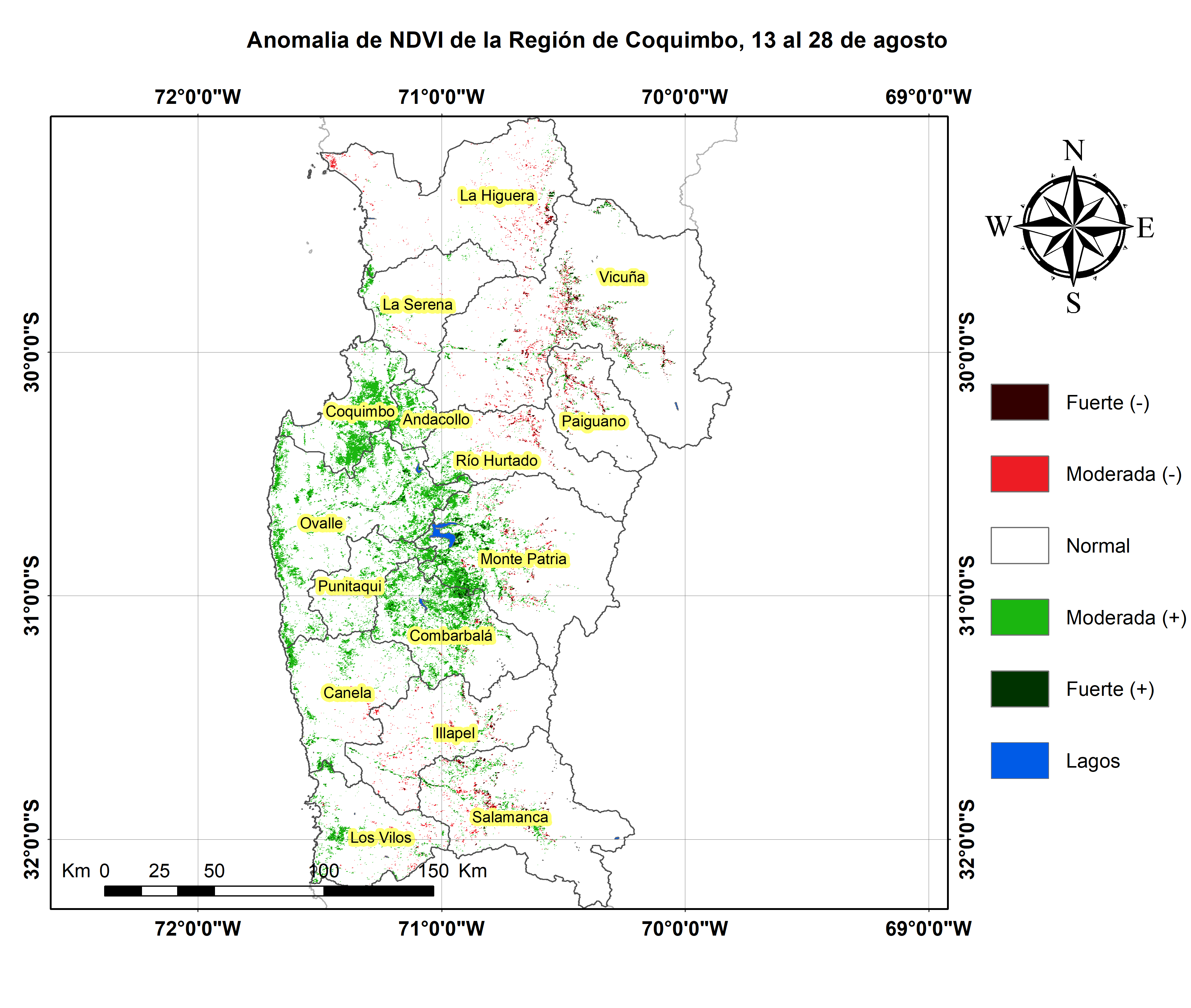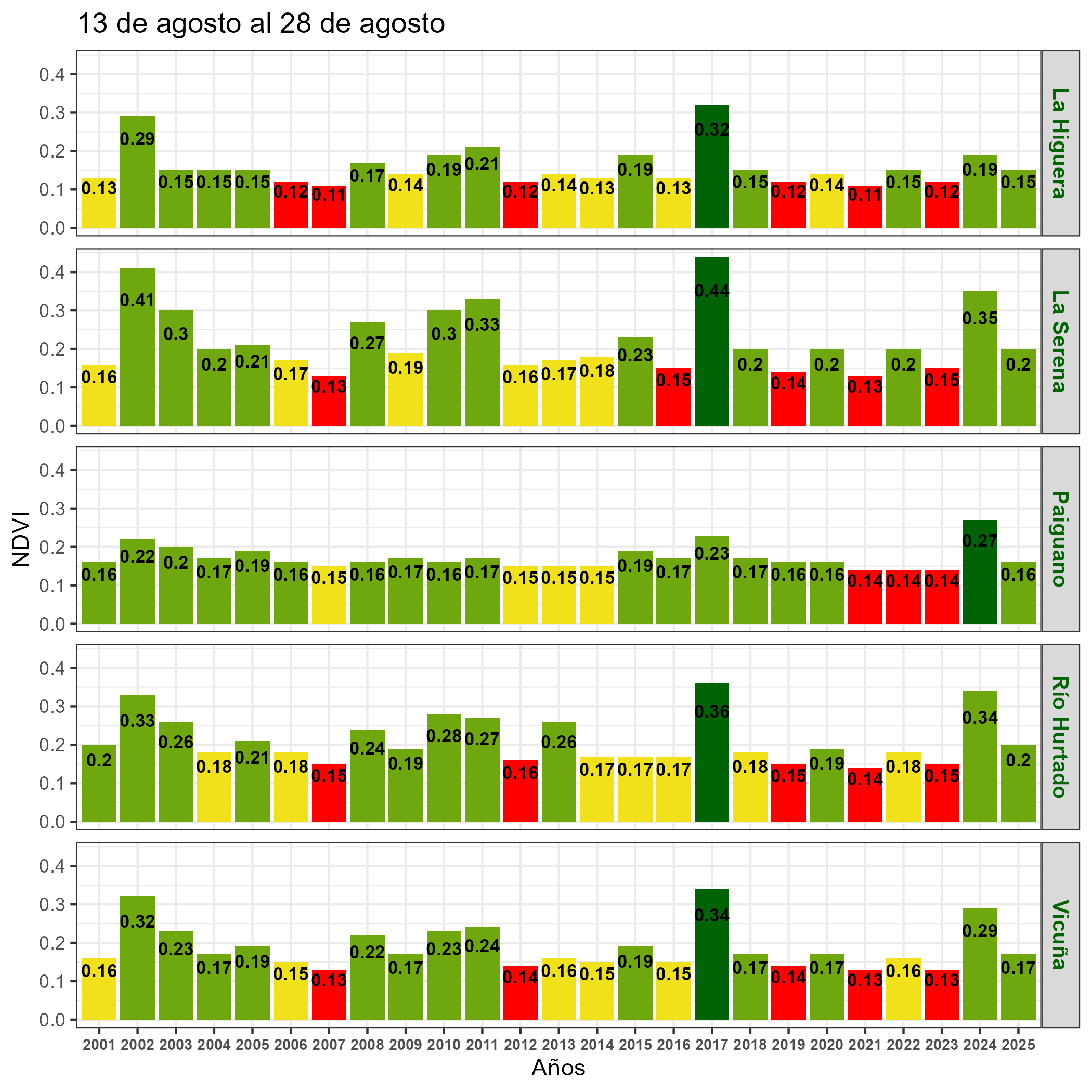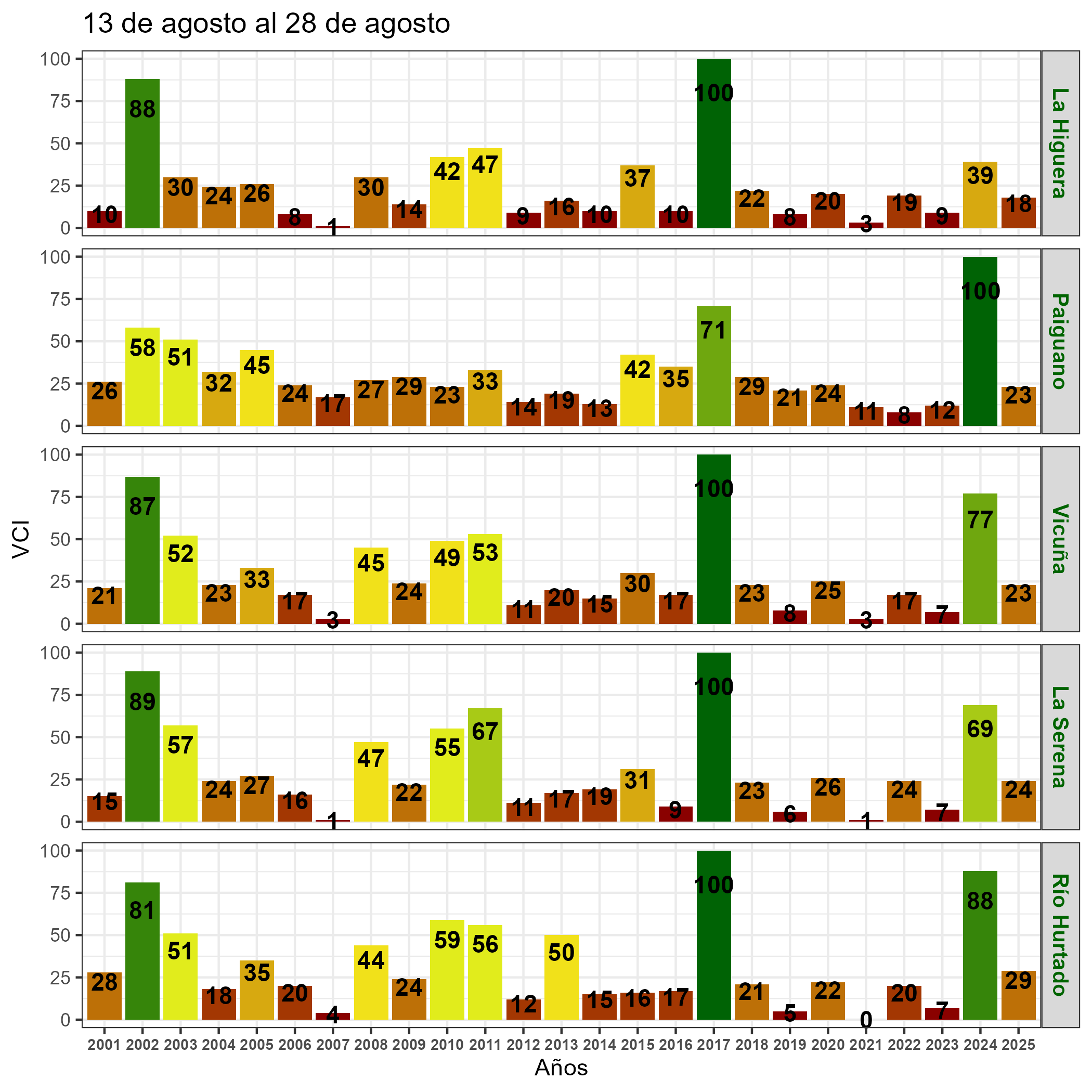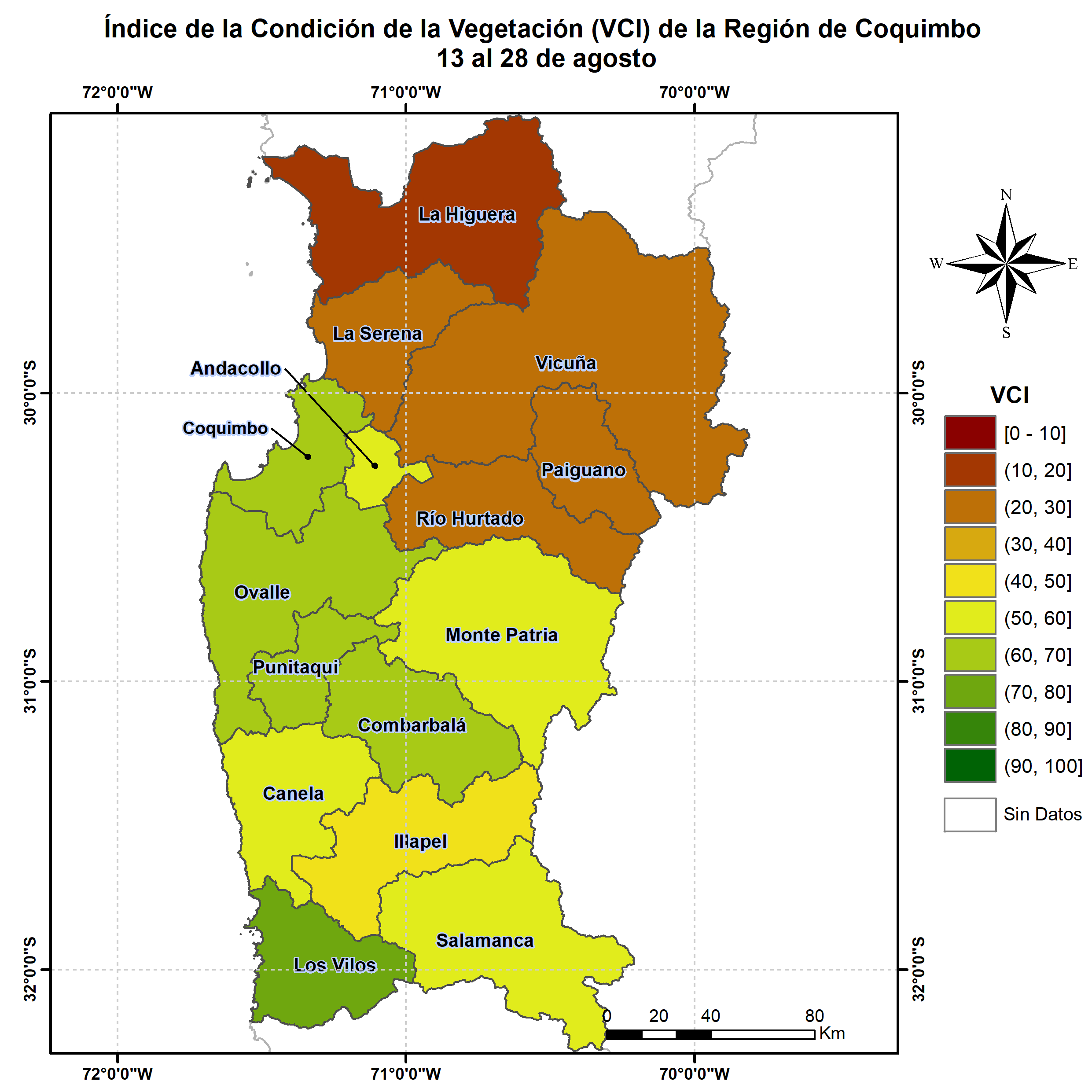 En términos globales la Región presentó un valor mediano de VCI de 48% para el período comprendido desde el 13 al 28 de agosto. A igual período del año pasado presentaba un VCI de 83% (Fig. 1). De acuerdo a la Tabla 1 la Región de Coquimbo, en términos globales presenta una condición Favorable.