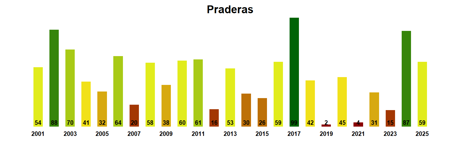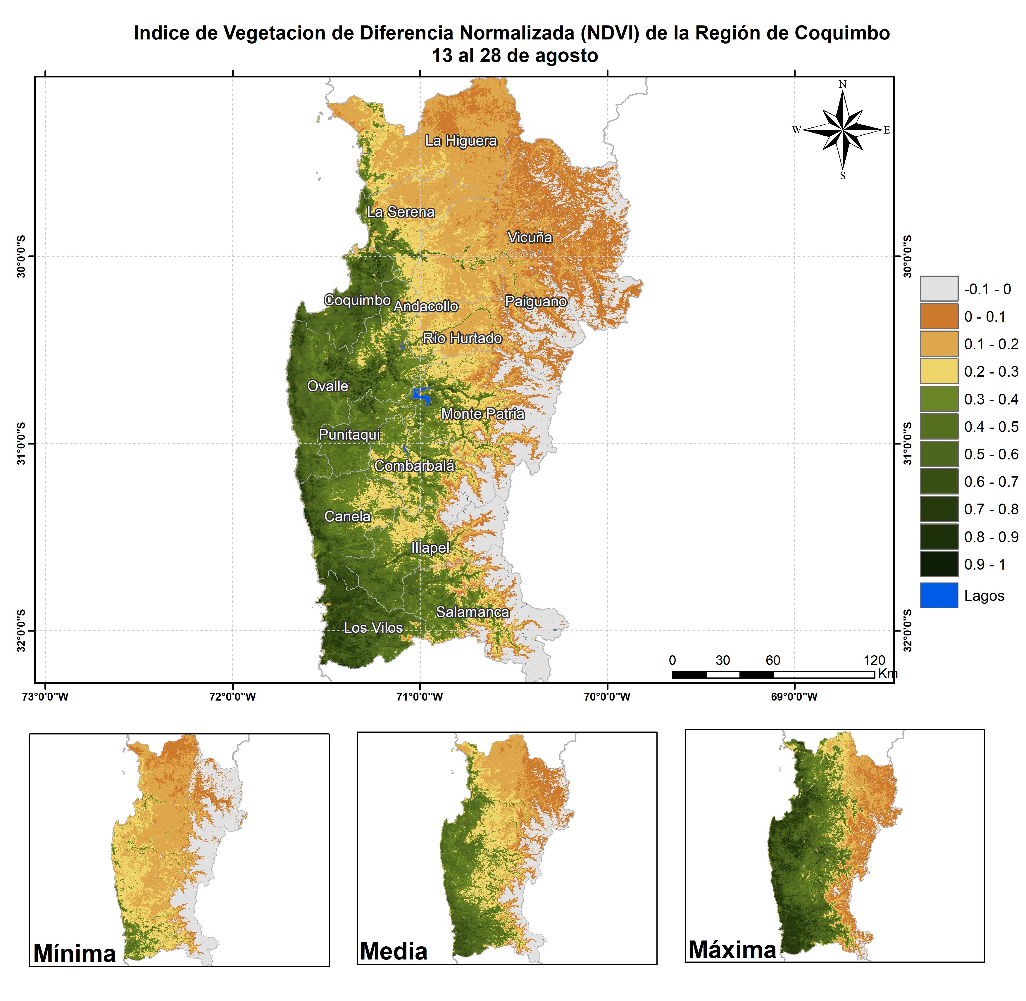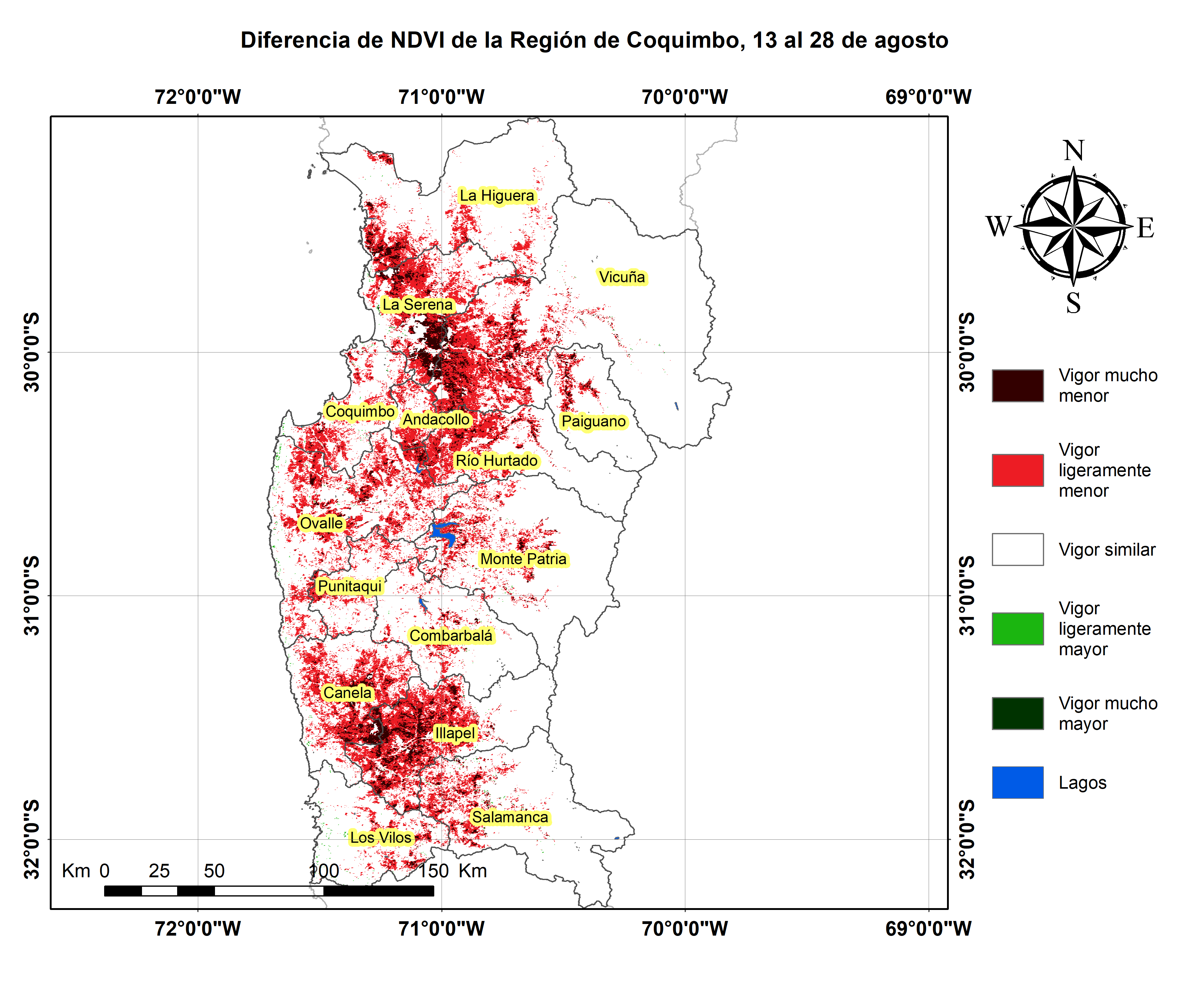 Respecto de la respuesta fisiológica de las plantas al efecto del clima, las imágenes satelitales reflejan la magnitud del crecimiento o disminución de la cobertura vegetal en esta época del año mediante el índice de vegetación NDVI (Desviación Normalizada del Índice de Vegetación).