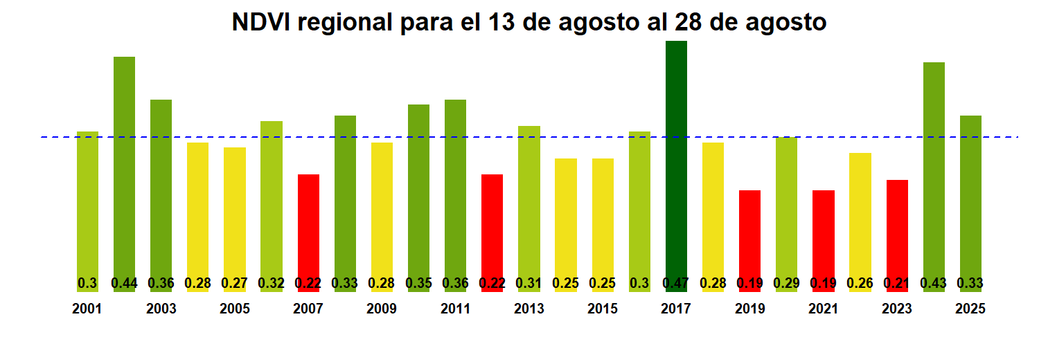 Para esta quincena se observa un NDVI promedio regional de 0.33 mientras el año pasado había sido de 0.43. El valor promedio histórico para esta región, en este período del año es de 0.3.