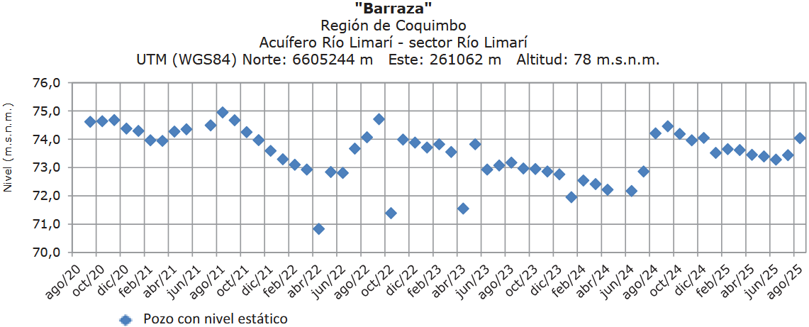 En el pozo Barraza (acuífero Río Limarí, sector Río Limarí), el nivel estático en agosto se situó en 74 m.s.n.m., equivalente a 4 m desde la superficie. Con esto registra un leve aumento con respecto a julio, con una incipiente recuperación frente a comienzos de año.
