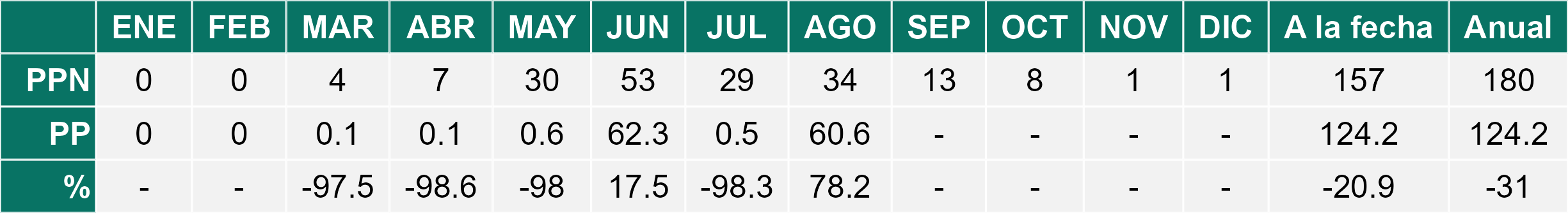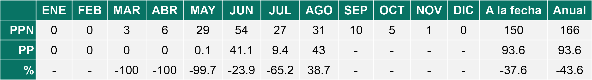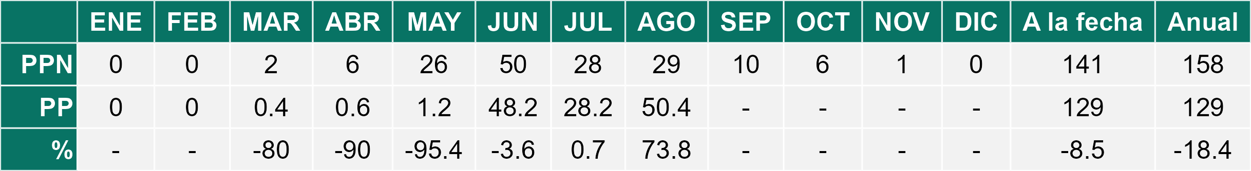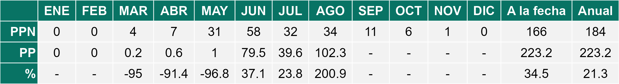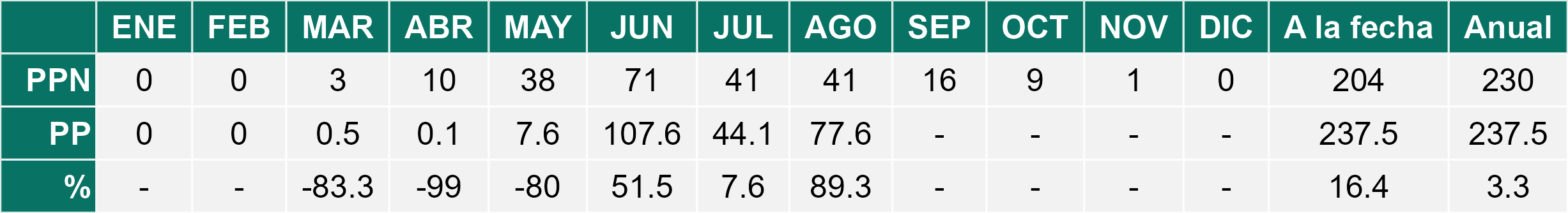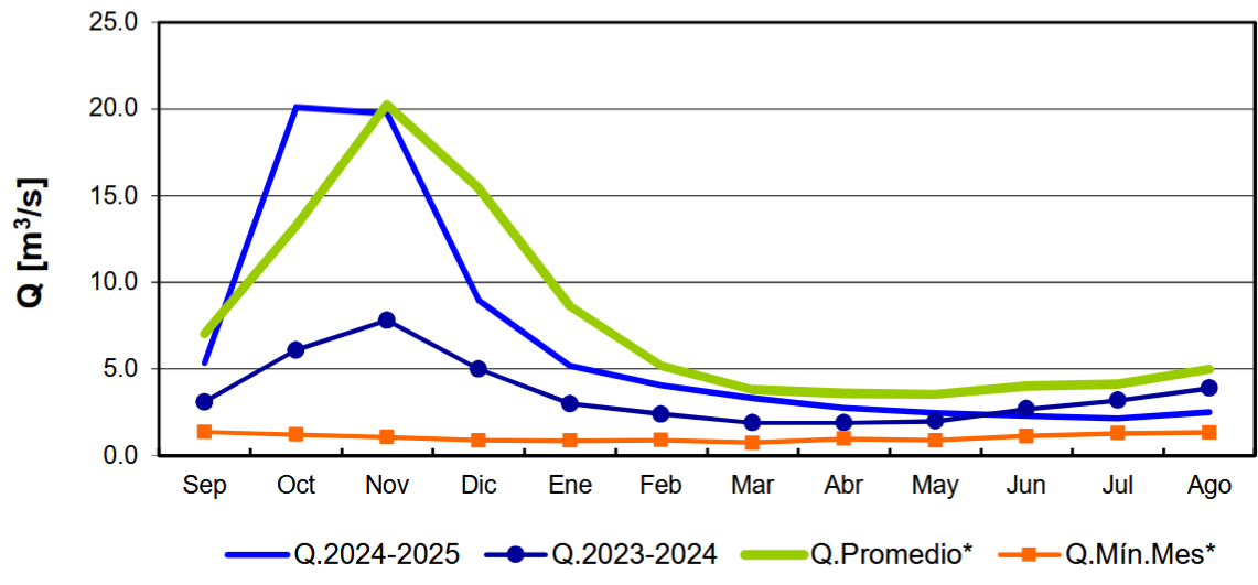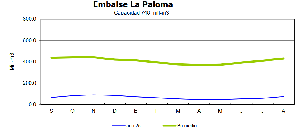 Por otro lado, el embalse La Paloma registró al 31 de agosto un volumen de 73,8 millones de m3, lo que representa un aumento de 26,2% respecto al mismo mes de 2024 (58,5 millones de m3). Este valor equivale al 17% del promedio histórico mensual (431 millones de m3) y corresponde al 10% de su capacidad total de almacenamiento (750 millones de m3).