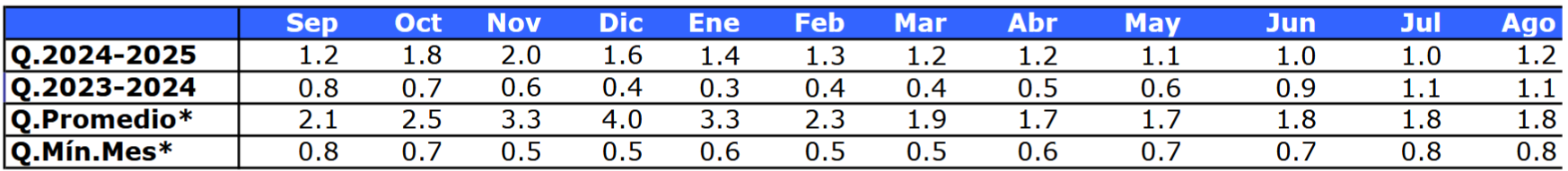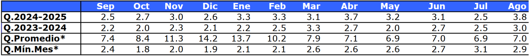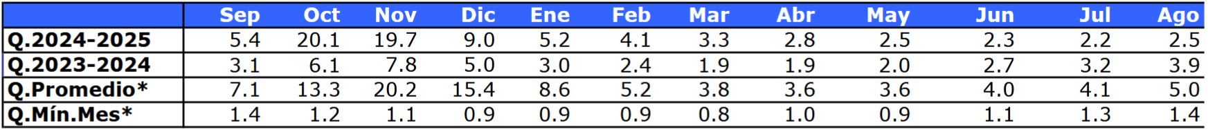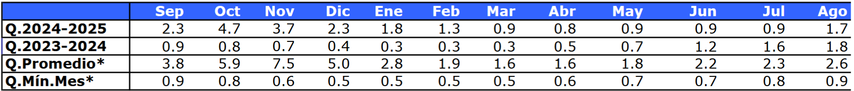 Río Choapa | 2,5 | 5,0 | -50,0% | 3,9 | -35,9% | 2,2 | +13,6% |