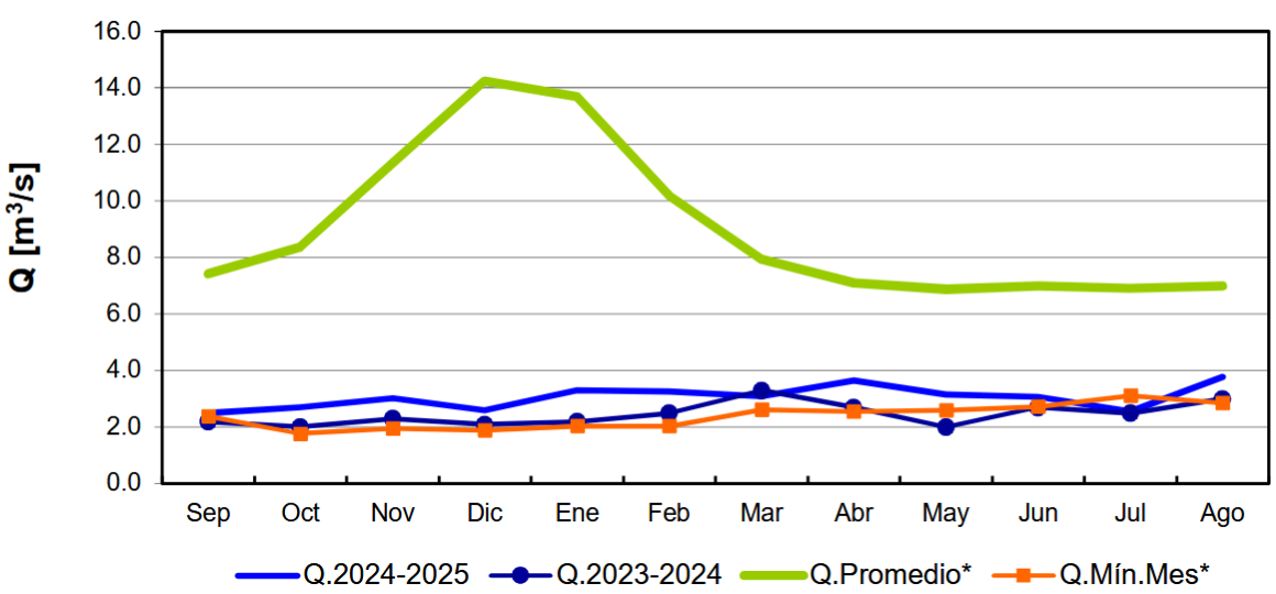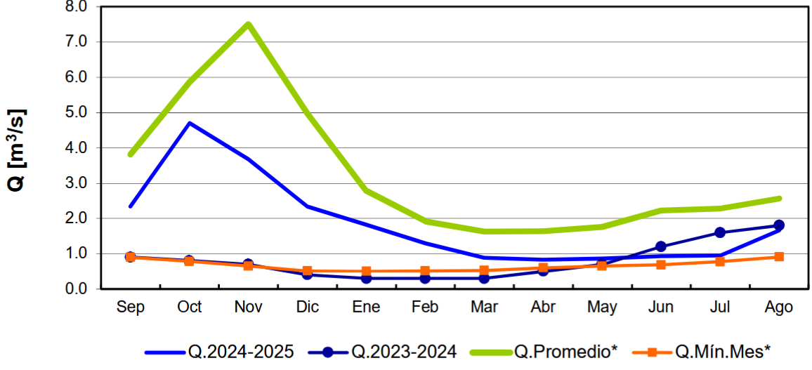 Así, para el período de agosto la estación Río Elqui en Algarrobal registró un caudal de 3,8 m3/s, 45,7% por debajo del promedio histórico (7,0 m3/s), aunque 26,7% más alto que en 2024 (3,0 m3/s). En relación al mes anterior r(2,5 m3/s), el caudal aumentó un 52,0%.