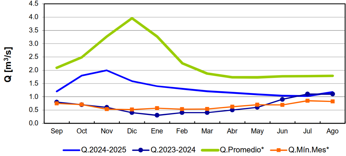 Asimismo, la estación Río Grande en Las Ramadas registró 1,7 m3/s, 34,6% por debajo del promedio histórico (2,6 m3/s) y prácticamente sin variación frente a 2024 (1,8 m3/s). En comparación con el mes anterior (0,9 m3/s), casi duplicó su valor (+88,9%).