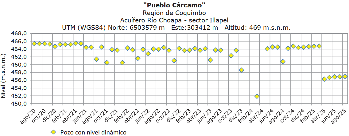 En el sector Illapel, pozo Pueblo Cárcamo (acuífero Río Choapa, sector Illapel) mostró en agosto un nivel en torno a 457 m.s.n.m., equivalente a 12 m desde la superficie, valor similar al mes previo, aunque se observa un descenso importante desde abril 2025.