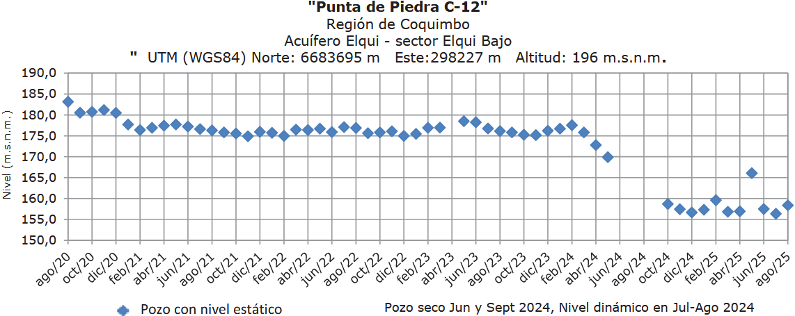 El pozo Punta de Piedra (acuífero Elqui, sector Elqui Bajo) registró en agosto un nivel estático de 160 m.s.n.m., equivalente a 36 m desde la superficie, levemente superior respecto a julio (156 m.s.n.m.), sin variaciones significativas en los últimos 10 meses.