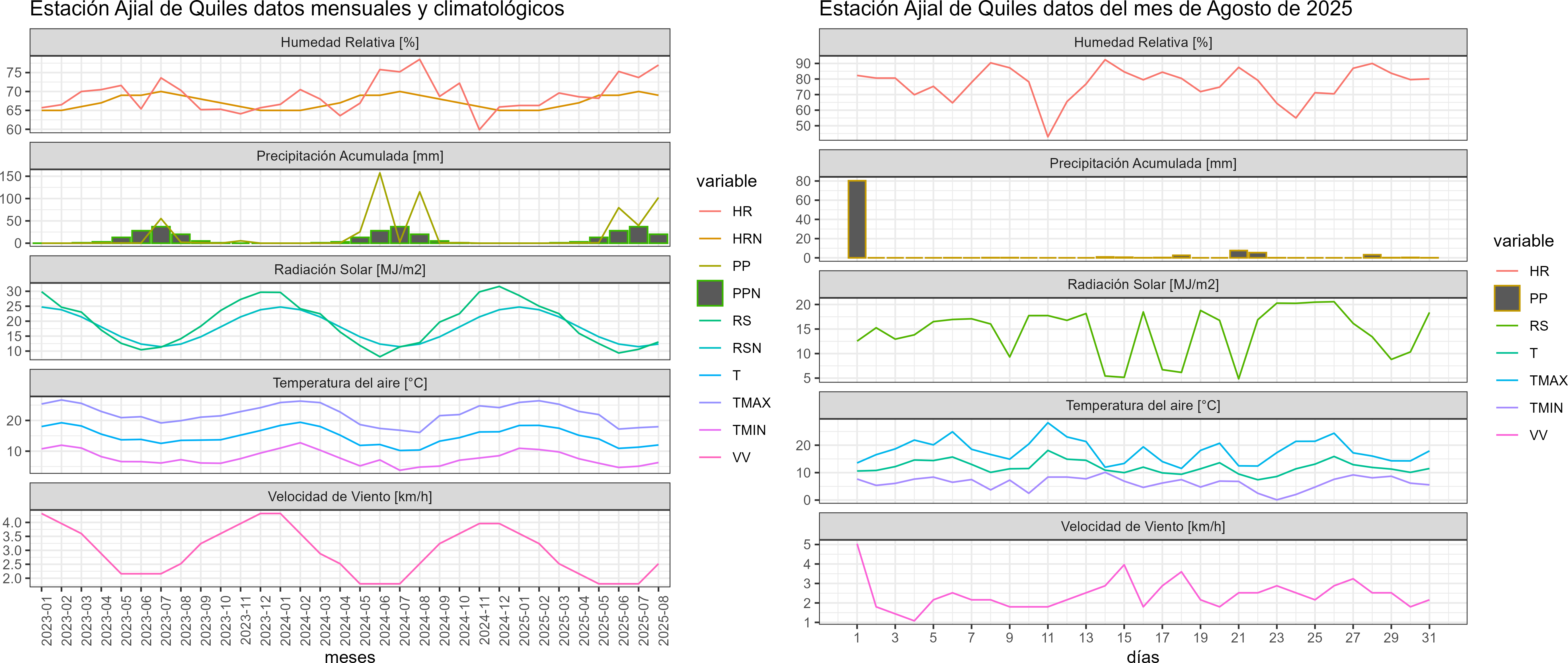 La estación Ajial de Quiles corresponde al distrito agroclimático 3-4-3. Para este distrito climático la temperatura mínima, media y máxima climatológicas alcanzan los 5°C, 10.7°C y 16.4°C respectivamente. Por su parte, respecto a las temperaturas medidas durante el mes de agosto en la estación: la temperatura mínima alcanzo los 6.3°C (1.3°C sobre la climatológica), la temperatura media 12°C (1.3°C sobre la climatológica) y la temperatura máxima llegó a los 18°C (1.6°C sobre la climatológica). En el mes de agosto se registró una pluviometría de 102.3 mm, lo cual representa un 300.9% con respecto al mismo mes de un año normal. De enero a agosto se ha registrado un total acumulado de 223.2 mm, en circunstancias que un año normal registraría a la fecha 166 mm, lo que representa un superávit de 34.5%. A la misma fecha, durante el año 2024 la precipitación alcanzaba los 115.1 mm.