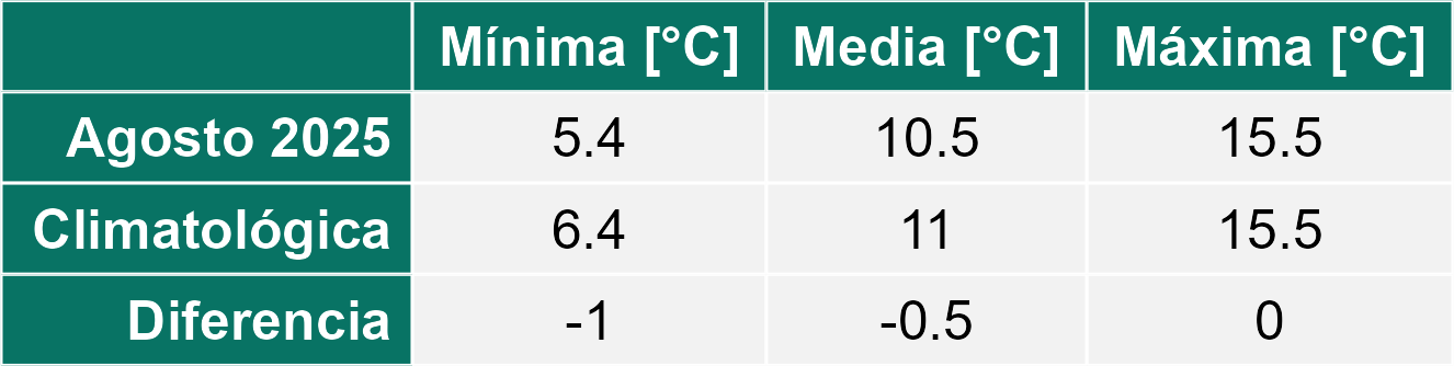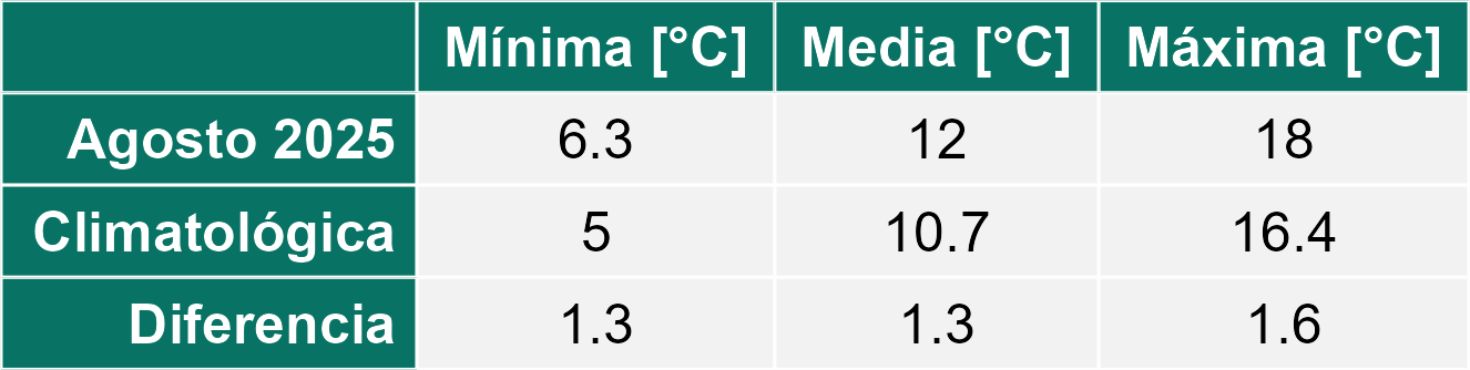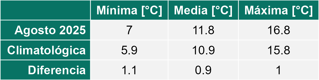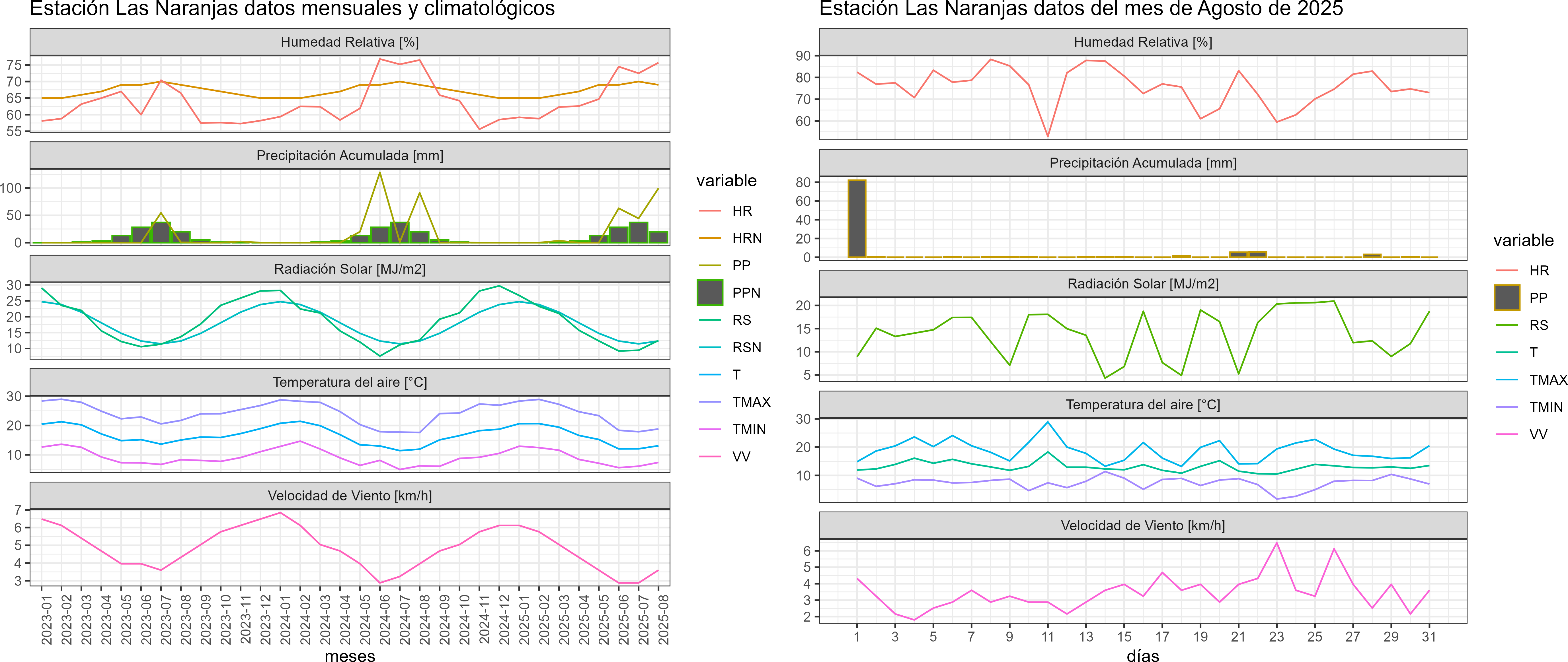 La estación Las Naranjas corresponde al distrito agroclimático 3-4-3. Para este distrito climático la temperatura mínima, media y máxima climatológicas alcanzan los 5.1°C, 10.7°C y 16.3°C respectivamente. Por su parte, respecto a las temperaturas medidas durante el mes de agosto en la estación: la temperatura mínima alcanzo los 7.4°C (2.3°C sobre la climatológica), la temperatura media 13.1°C (2.4°C sobre la climatológica) y la temperatura máxima llegó a los 18.8°C (2.5°C sobre la climatológica). En el mes de agosto se registró una pluviometría de 99.5 mm, lo cual representa un 301.5% con respecto al mismo mes de un año normal. De enero a agosto se ha registrado un total acumulado de 210.2 mm, en circunstancias que un año normal registraría a la fecha 164 mm, lo que representa un superávit de 28.2%. A la misma fecha, durante el año 2024 la precipitación alcanzaba los 91.2 mm.