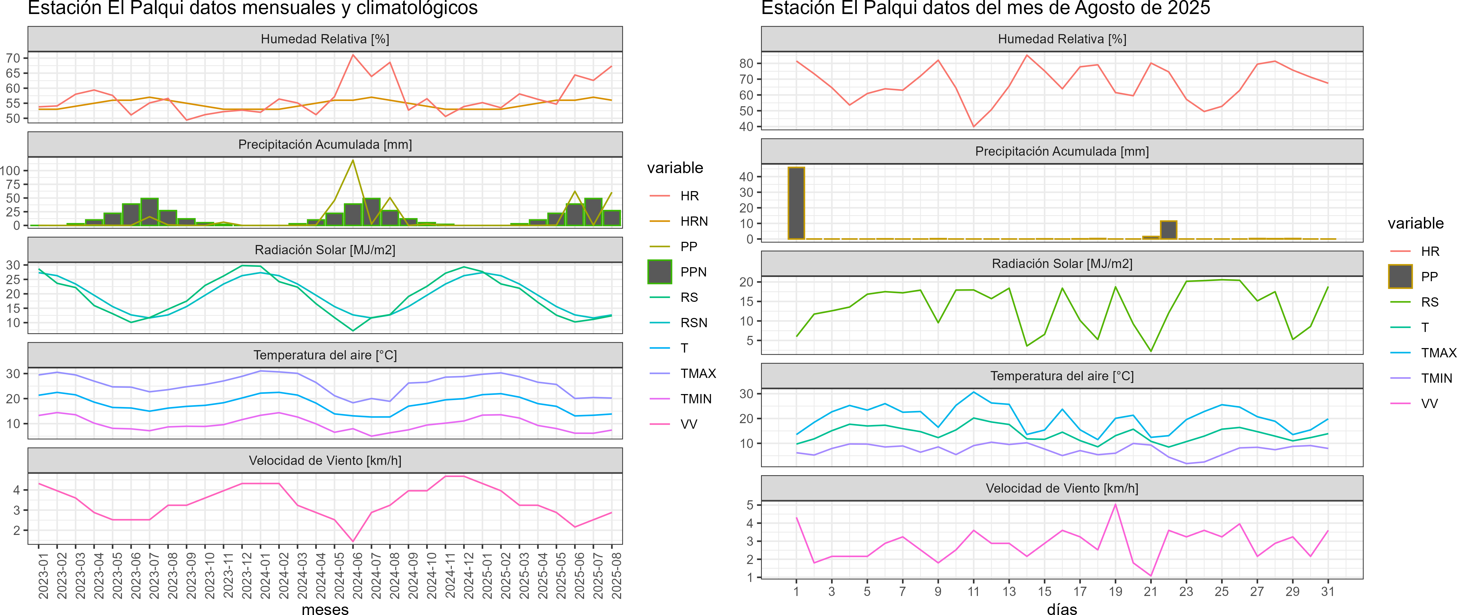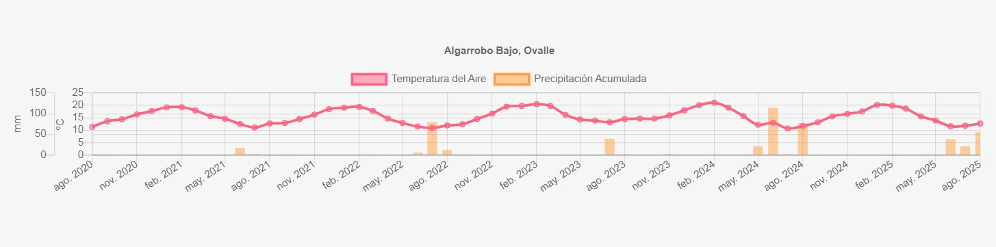 La estación El Palqui corresponde al distrito agroclimático 4-7. Para este distrito climático la temperatura mínima, media y máxima climatológicas alcanzan los 5.9°C, 14.2°C y 22.4°C respectivamente. Por su parte, respecto a las temperaturas medidas durante el mes de agosto en la estación: la temperatura mínima alcanzo los 7.4°C (1.5°C sobre la climatológica), la temperatura media 13.9°C (-0.3°C bajo la climatológica) y la temperatura máxima llegó a los 20.2°C (-2.2°C bajo la climatológica). En el mes de agosto se registró una pluviometría de 60.6 mm, lo cual representa un 178.2% con respecto al mismo mes de un año normal. De enero a agosto se ha registrado un total acumulado de 124.2 mm, en circunstancias que un año normal registraría a la fecha 157 mm, lo que representa un déficit de 20.9%. A la misma fecha, durante el año 2024 la precipitación alcanzaba los 50.7 mm.