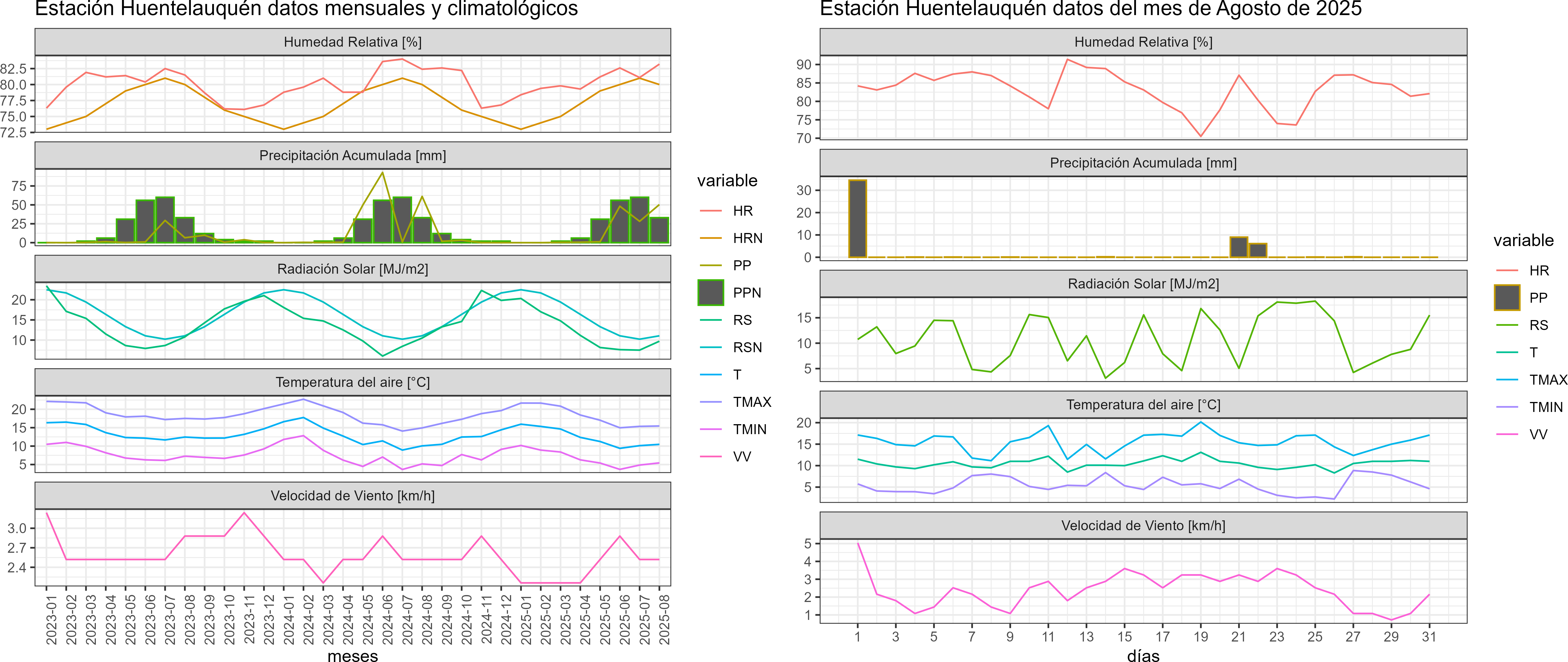 La estación Huentelauquén corresponde al distrito agroclimático 4-1. Para este distrito climático la temperatura mínima, media y máxima climatológicas alcanzan los 6.4°C, 11°C y 15.5°C respectivamente. Por su parte, respecto a las temperaturas medidas durante el mes de agosto en la estación: la temperatura mínima alcanzo los 5.4°C (-1°C bajo la climatológica), la temperatura media 10.5°C (-0.5°C bajo la climatológica) y la temperatura máxima llegó a los 15.5°C (Igual la climatológico). En el mes de agosto se registró una pluviometría de 50.4 mm, lo cual representa un 173.8% con respecto al mismo mes de un año normal. De enero a agosto se ha registrado un total acumulado de 129 mm, en circunstancias que un año normal registraría a la fecha 141 mm, lo que representa un déficit de 8.5%. A la misma fecha, durante el año 2024 la precipitación alcanzaba los 61.2 mm.